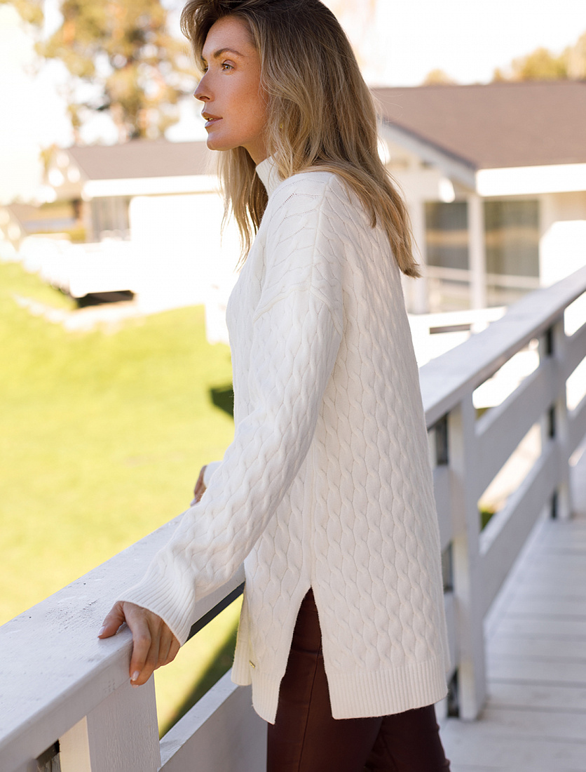 Свитер фактурной вязки косы выполнен из мягкой пряжи с кашемиром. Удлиненная свободная модель впишется в любой гардероб и поможет создать стильные расслабленные образы для любой фигуры. Нежная пряжа приятно ощущается на теле. Отдельным украшением служит металлический логотип бренда.