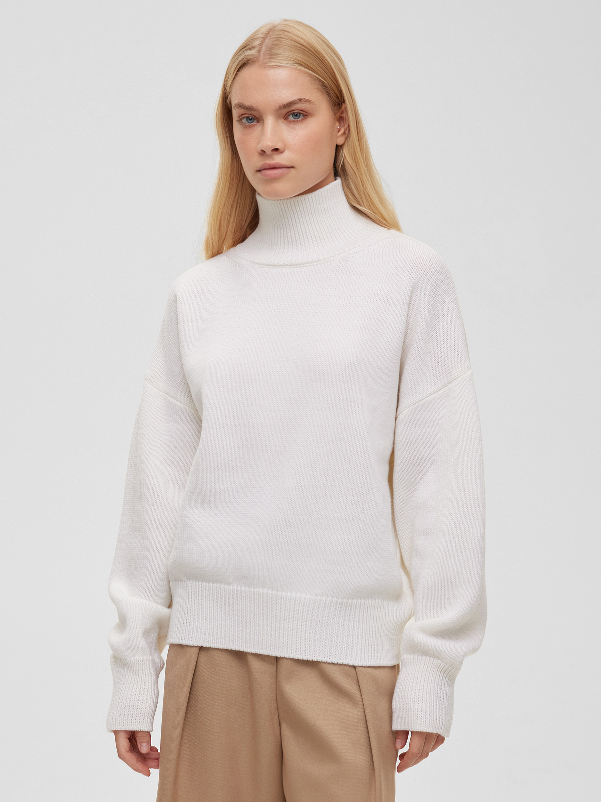 Свитер свободного кроя со спущенной линией плеча — наш неизменный хит продаж уже 9 лет. Дизайн с классическим воротником-стойкой и резинками на рукавах, а также по низу изделия делает свитер универсальной вещью для вашего базового гардероба.