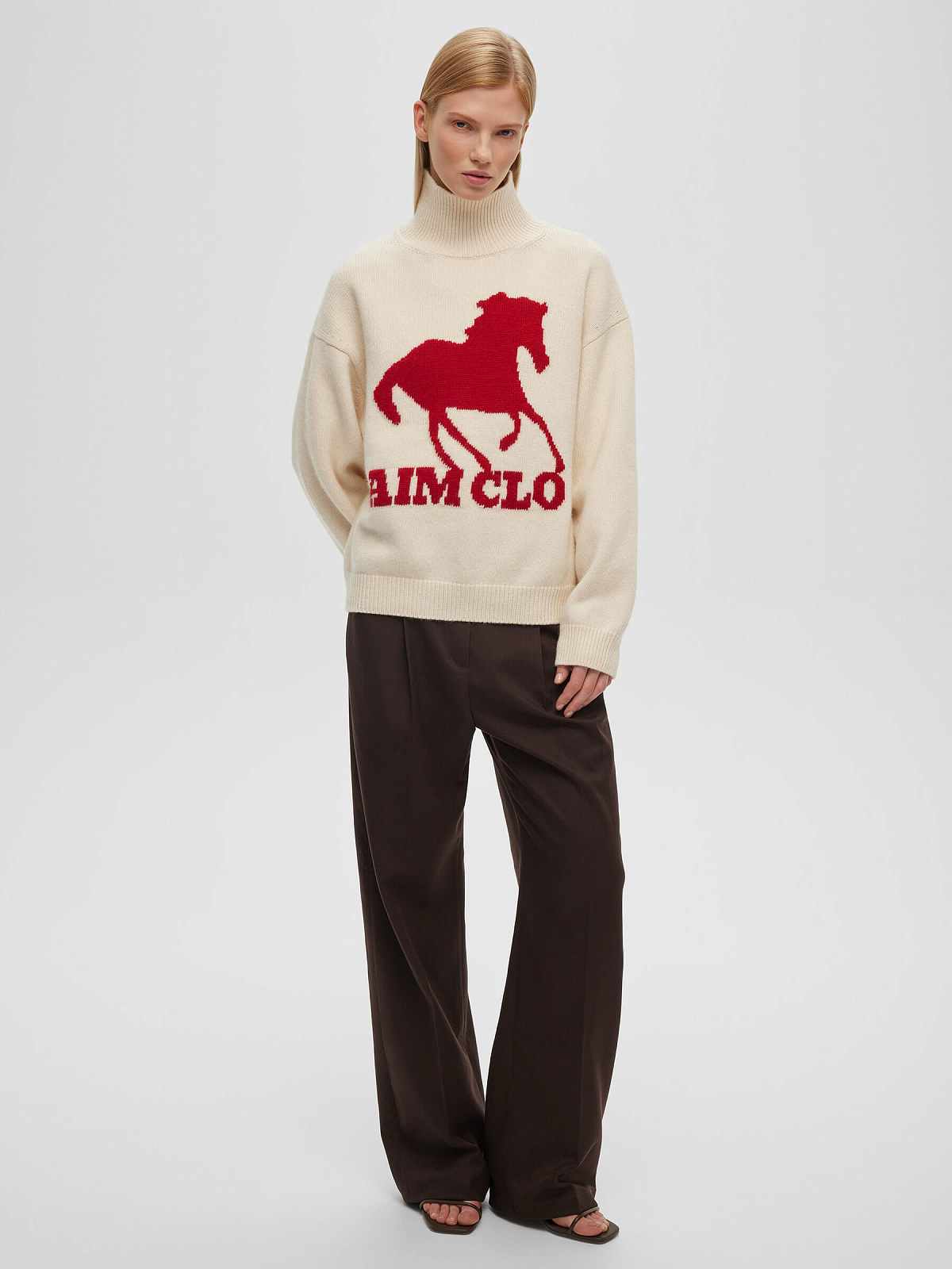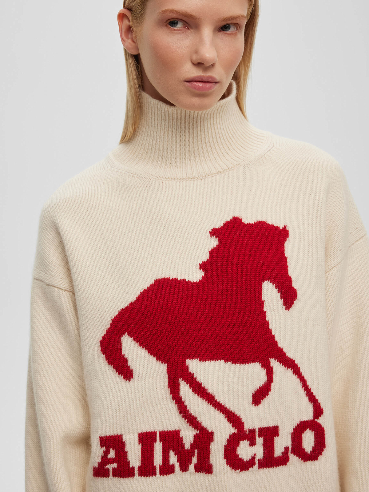 Свитер свободного кроя с интарсией лошадь, молочно-красный
