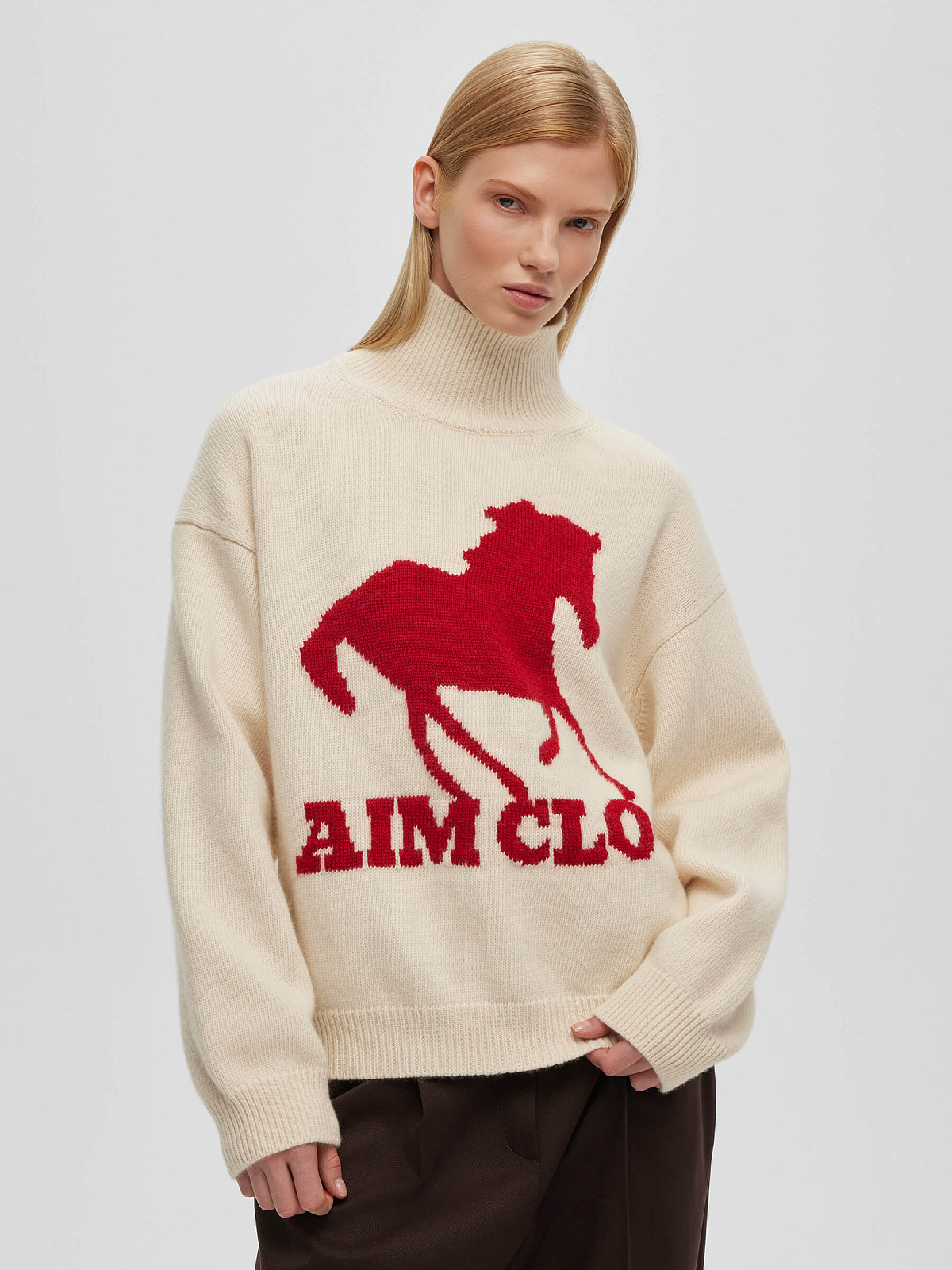 Свитер свободного кроя с принтом «лошадь», вывязанным в специальной технике – интарсия. Спущенное плечо, воротник-стойка, резинка на рукавах и по низу изделия.