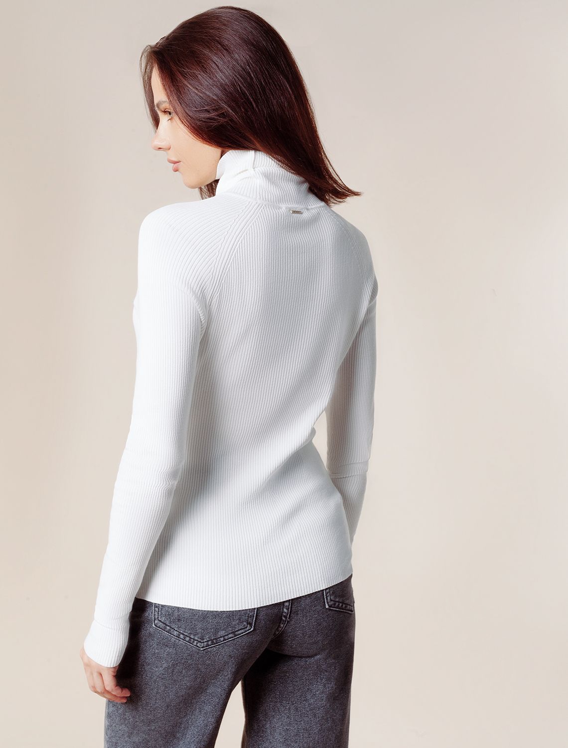 Свитер тонкой вязки в рубчик выполнен из мягкой пряжи на основе вискозы. Изделие почти не ощущается на теле, но при этом поддерживает ощущение уюта в течение всего дня. Не перегревает и поддерживает оптимальный микроклимат. Будет комфортно и в офисе, и на прогулке в городе. Подходит для любого типа фигуры.