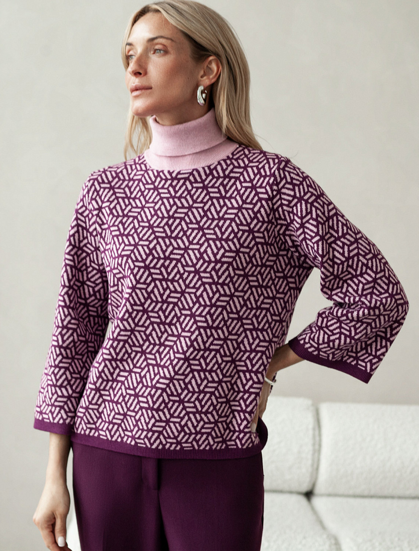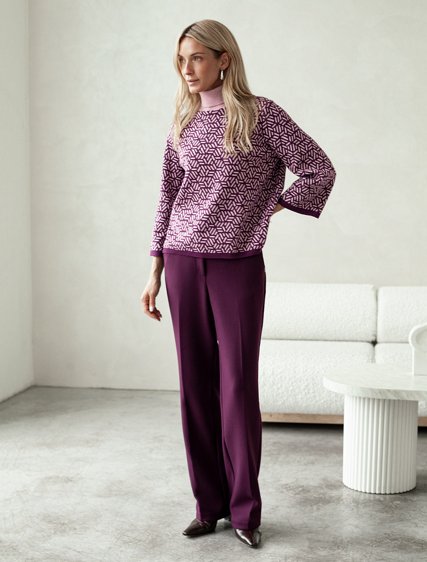 Свитер жаккардовой вязки выполнен из нежной пряжи на основе вискозы с добавлением кашемира. Модель свободного силуэта с укороченным рукавом подходит для любой фигуры. Жаккардовый узор выглядит дорого и роскошно, делая любой образ респектабельным. Нежная пряжа комфортно ощущается на теле, сохраняя оптимальное тепло при этом не перегревая 50%Вис 20%ПА 20%ПЭ 10%Кашемир