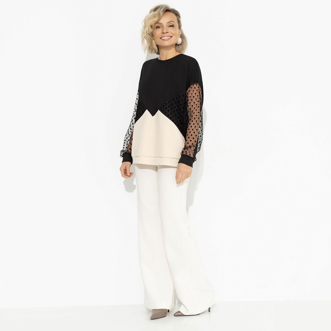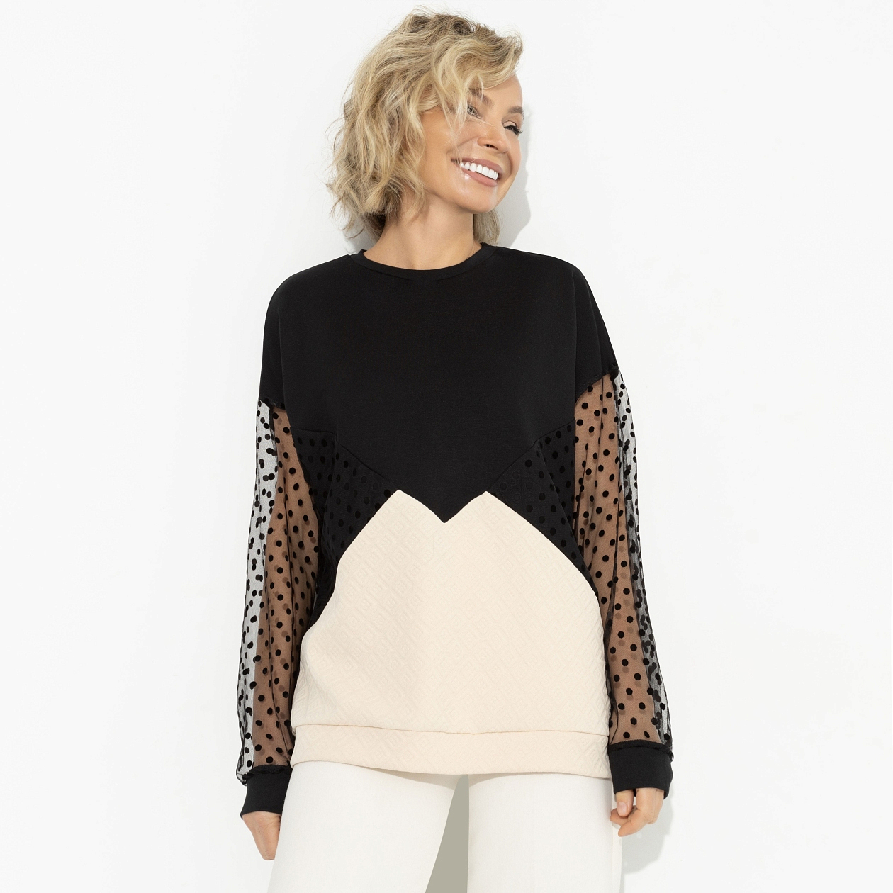 Много ли идей одновременно крутятся в вашей голове? Что приготовить на ужин, как ответить коллеге и куда поехать в отпуск. Нет только мыслей о том, что надеть. Ведь умопомрачительный свитшот снял этот груз с ваших плеч. Свитшот классического свободного кроя. Комбинация нескольких видов ткани. Рукава оформлены сеткой в горох. Светлый материал текстурный.