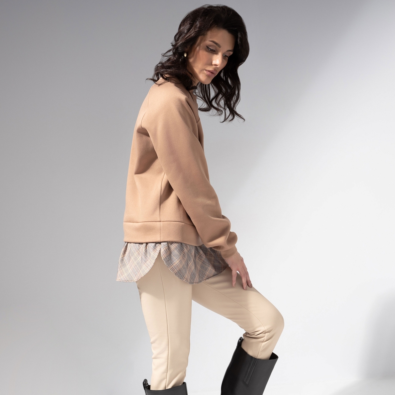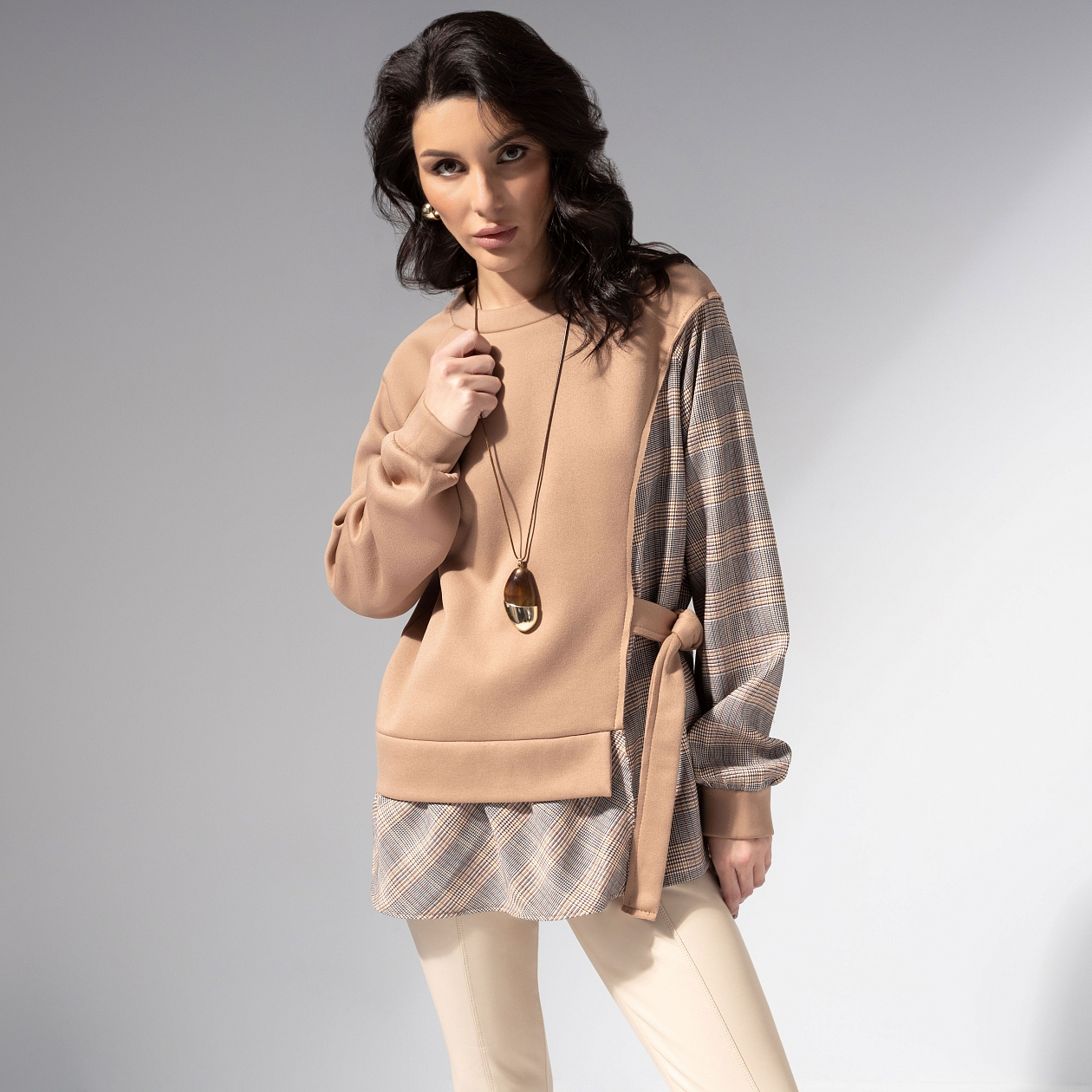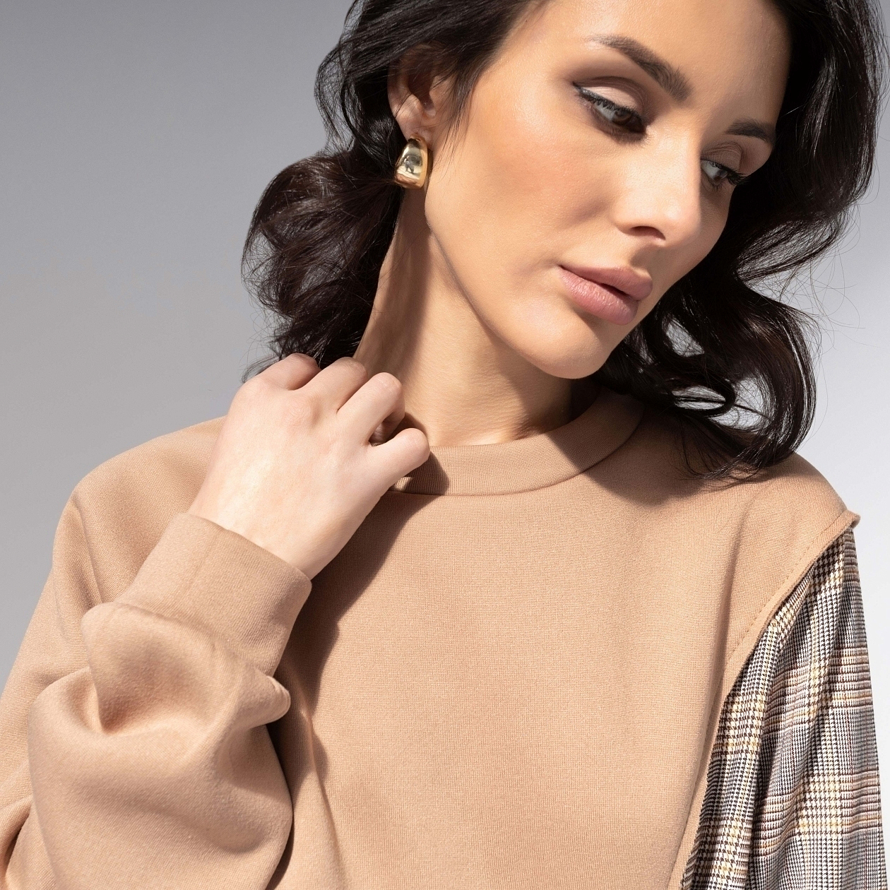 Ода спокойствию и хорошему вкусу. Свитшот ЧАРУТТИ в мягкой палитре воплощает эстетику утреннего света – когда день только начинается, а настроение уже идеальное. Беж – цвет уверенности и баланса. Свитшот прямого кроя с асимметричной вставкой и поясом-завязкой сбоку. Рукава из рубашечной клетки создают игру фактур. Модель сохраняет форму и комфорт при движении, ткань не капризна в уходе, не теряет мягкость. Акцентная обработка швов.