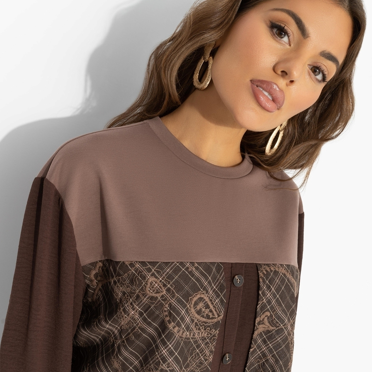 Фьюжн ‒ в офисном гардеробе! Этот свитшот прогоняет скуку серых будней: сочетание фактур, оттенков и узоров намекает, что смелость в стиле ‒ вещь только для взрослых. Любите эксперименты? Вам сюда. Свитшот из трикотажа в комбинации нескольких видов ткани. Гамма шоколадных оттенков, свободный крой.
