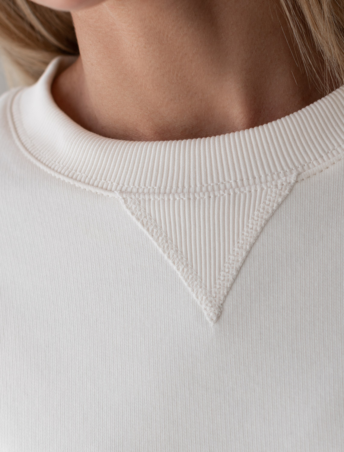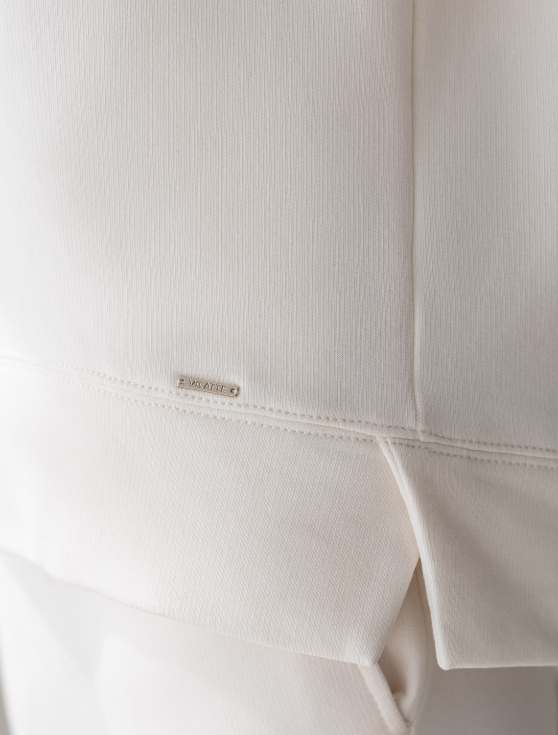 Свитшот среднего объема молочного цвета выполненный из футера двухнитки без начеса - идеально подойдет для создания стильного и комфортного образа. Эластан в составе поддерживает формоустойчивость, а премиальный хлопок обеспечивает дышащие свойства и мягкость материала.