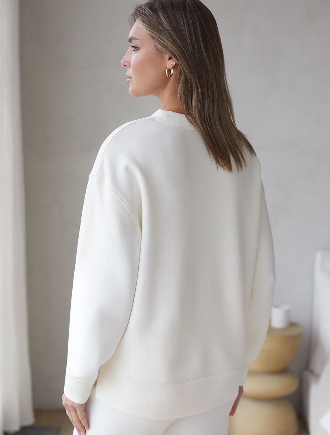 Свитшот среднего объема молочного цвета выполненный из футера двухнитки без начеса - идеально подойдет для создания стильного и комфортного образа. Эластан в составе поддерживает формоустойчивость, а премиальный хлопок обеспечивает дышащие свойства и мягкость материала.