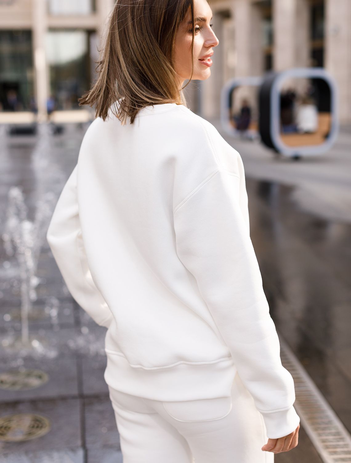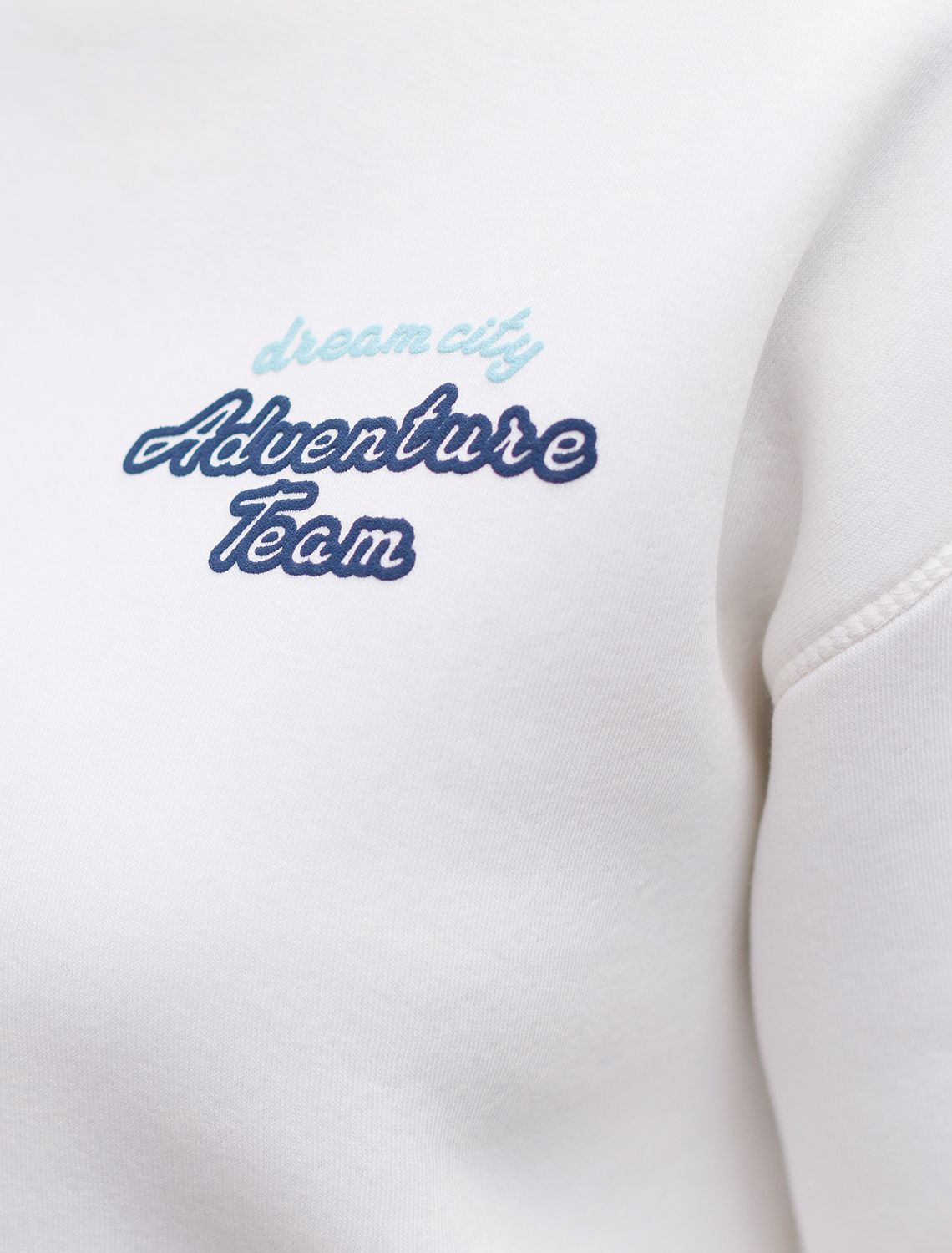 Свитшот с круглым воротом выполнен из премиального футера трехнитки с теплым начесом. Модель дополнена фактурным лаконичным принтом. Перевод: «Клуб искателей приключений в городе мечты». Свободный крой подходит для любой фигуры и впишется в любой гардероб.