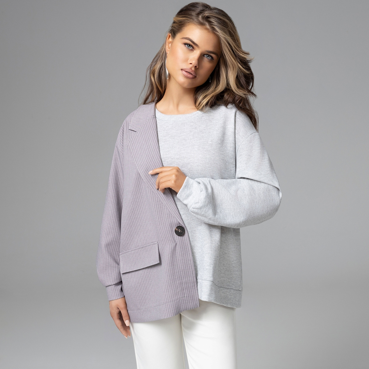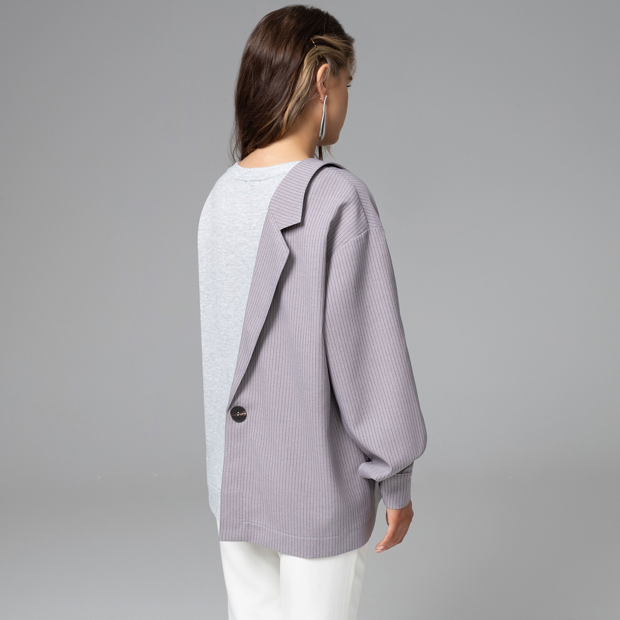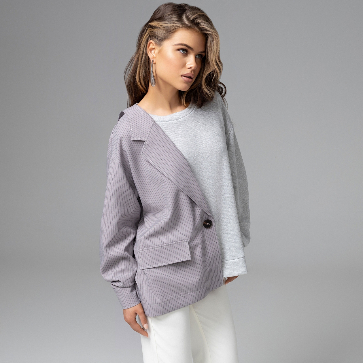 Достаточно одной вещи, чтобы весь образ выглядел дороже. Свитшот ЧАРУТТИ построен на игре архитектуры: половина строгого жакета, половина расслабленного свитшота. Такой баланс формы и комфорта мгновенно выдаёт продвинутое чувство стиля. Контраст фактур усиливает эффект: костюмная ткань «тайваньский лён» держит чёткую линию силуэта, а мягкий футер добавляет образу расслабленную пластичность. Асимметричная композиция визуально собирает фигуру и делает вещь центром всего образа. Кажется, будто твой стиль продуман на несколько шагов вперёд.