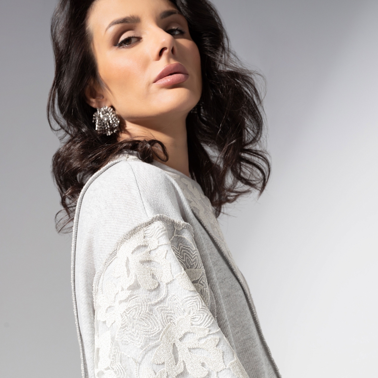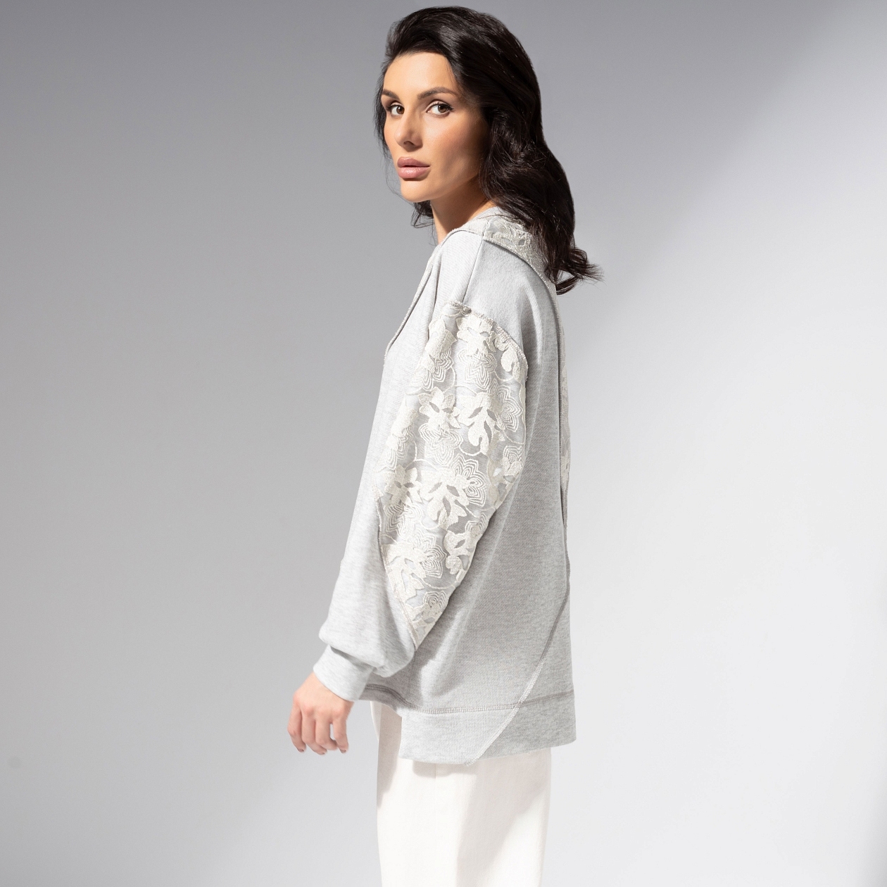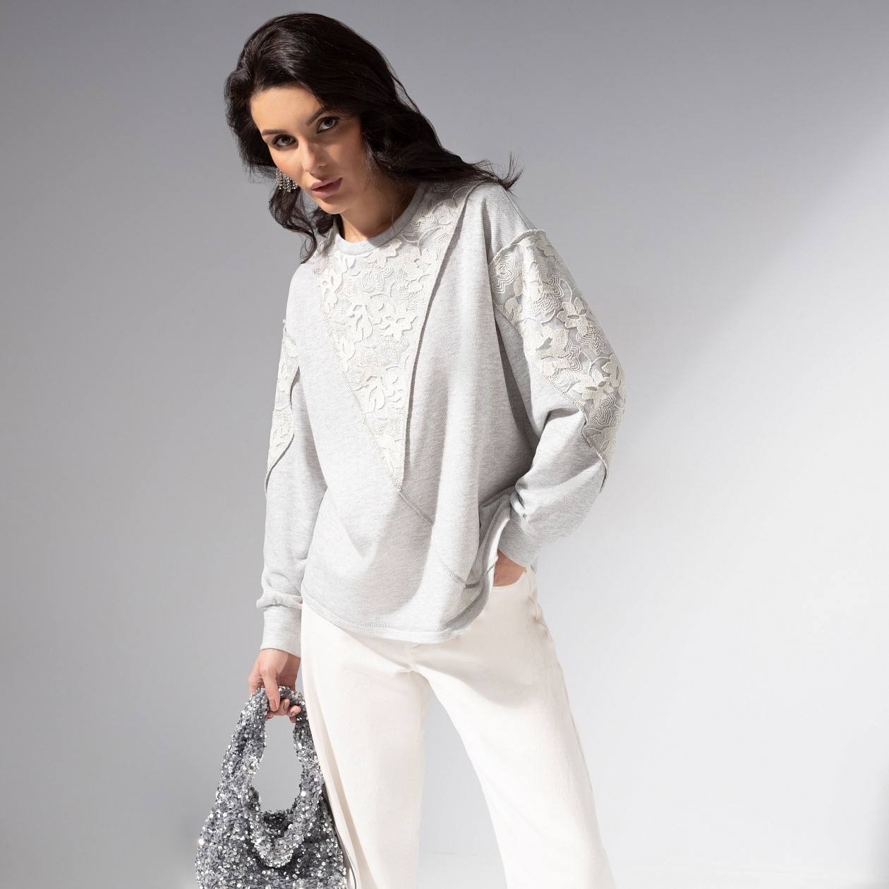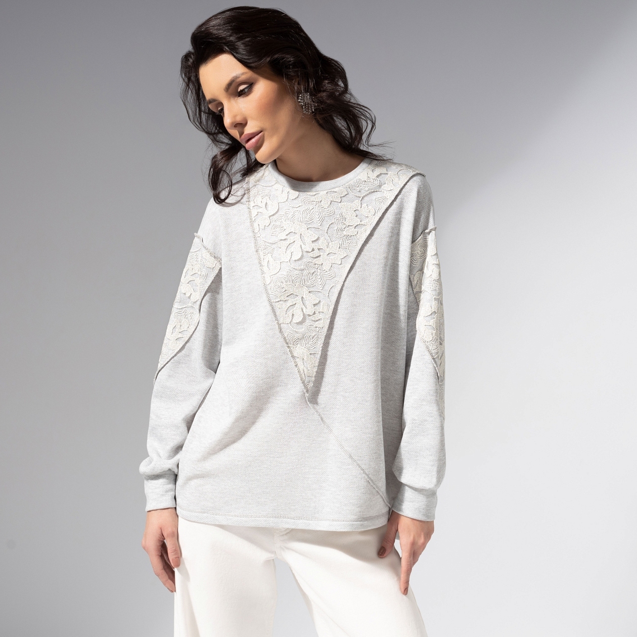 Осторожно, нежность... Этот свитшот притягивает внимание так же естественно, как свет манит за собой тень. Мягкий серый оттенок с сиянием металлик делает образ деликатным, но выразительным. Комбинированный свитшот из хлопкового футера и ажурного кружева с металлизированной нитью. Комфортный прямой крой, круглый вырез, манжеты на резинке. Акцентные швы наружу.