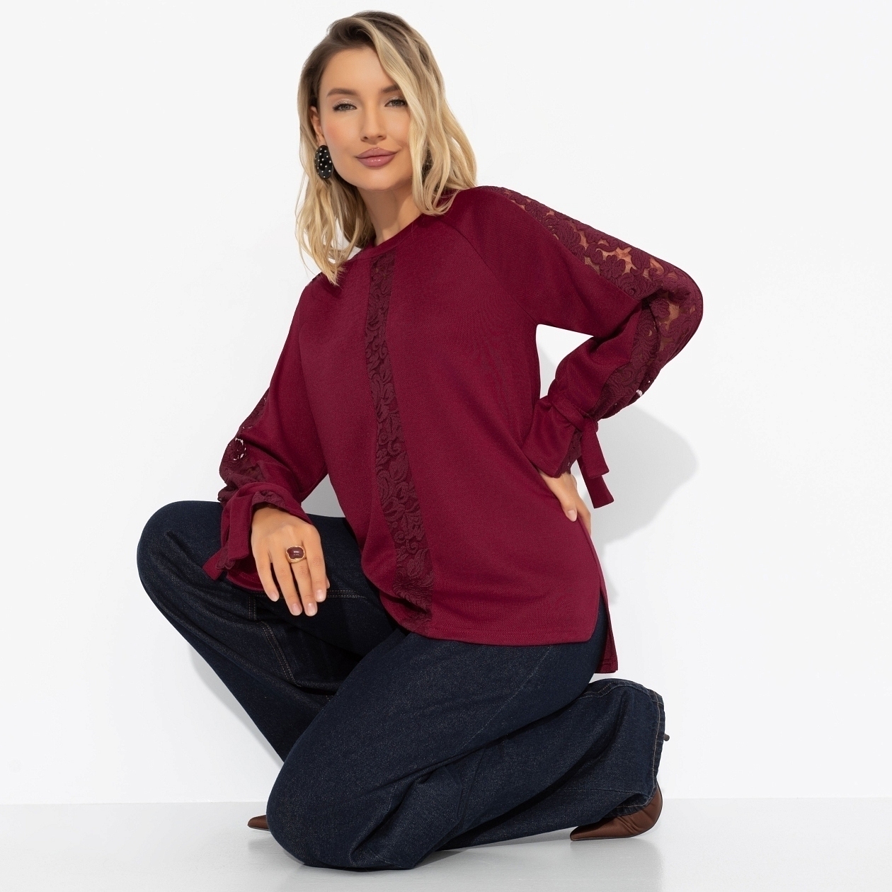 Свитшот ЧАРУТТИ чувствуется буквально как пропуск в круг душевных людей. Его винный цвет, комбинация фактур и детали располагают к себе с первой же минуты. Абсолютный комфорт обеспечен. Свитшот свободного силуэта. Акцентные вставки из кружева в тон основного материал. Завязки на рукавах.