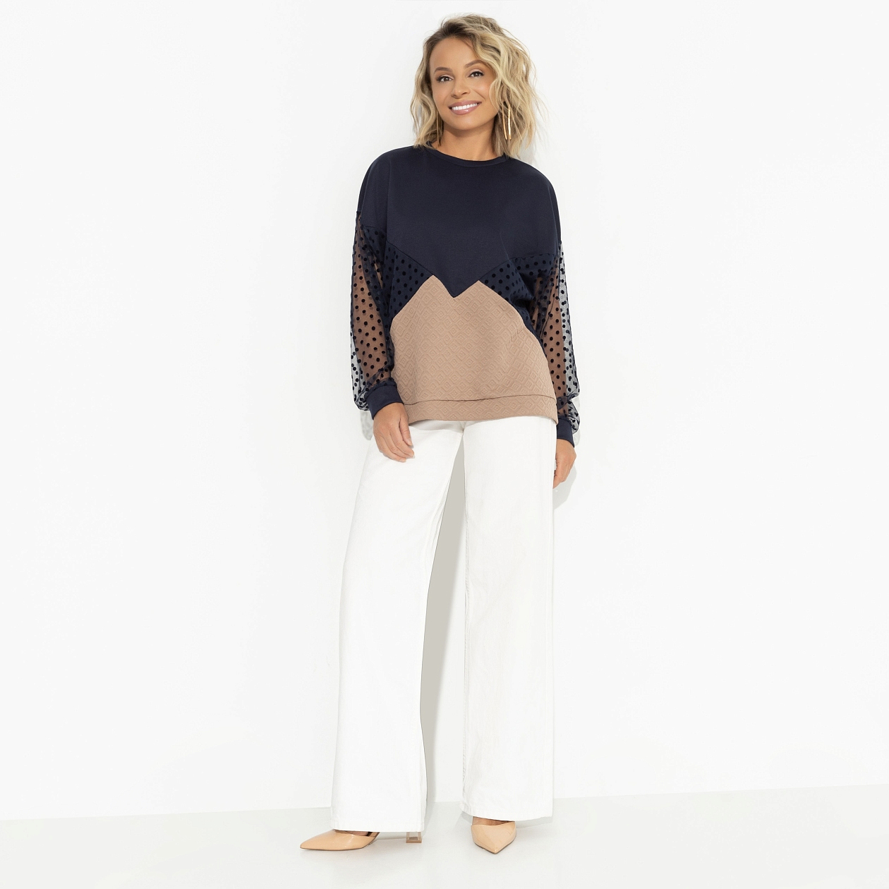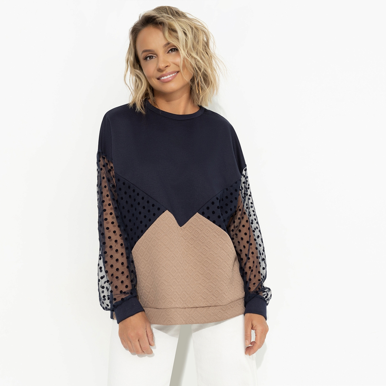 Черничный пирог, в котором очень тонкий слой теста и щедрый объем свежей ягоды. Так мы видим свитшот CHARUTTI в сочетании бежевого и чернично-синего. Лакомый кусочек, что сказать. Свитшот в комбинации нескольких видов ткани. Материал основной части изделия текстурный. Рукава оформлен тонким кружевом. Посадка свитшота свободная. Подойдет любому типу фигуры.