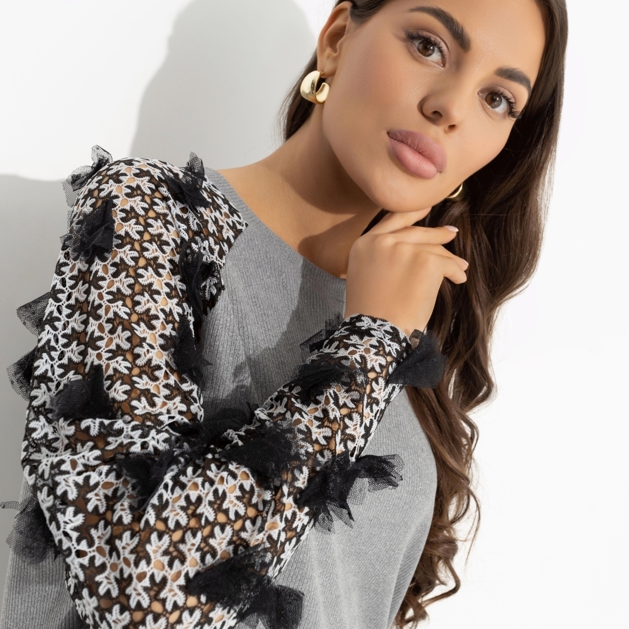 Первая корпоративная вечеринка на новой работе? Важно быть собой, не преувеличивая и не преуменьшая свои достоинства. Лаконичный стиль, отражающий твою натуру – свитшот CHARUTTI. Просто и со вкусом. Свитшот классического кроя. Ассиметричный крой. Один рукав выполнен из кружева с объемным декором. Свитшот хорошо смотрится в заправленном виде и навыпуск.