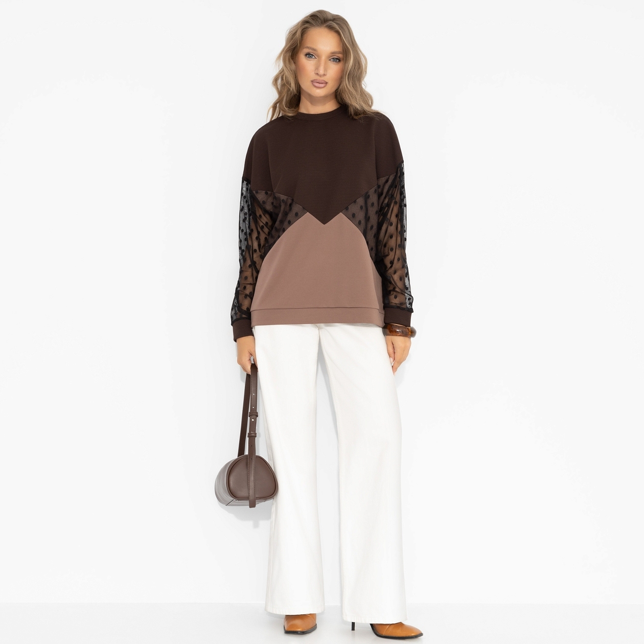 Комфорт с ноткой соблазна. Неожиданное сочетание фактур – мягкий трикотаж и полупрозрачная сетка – создаёт игру света и настроения. Выбирай стиль с характером! Стильный свитшот свободной посадки в комбинации нескольких видов ткани. Рукава просвечивают.