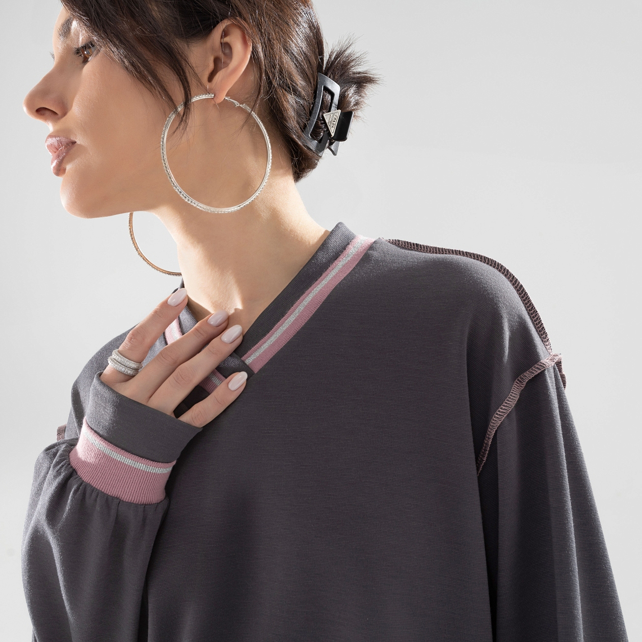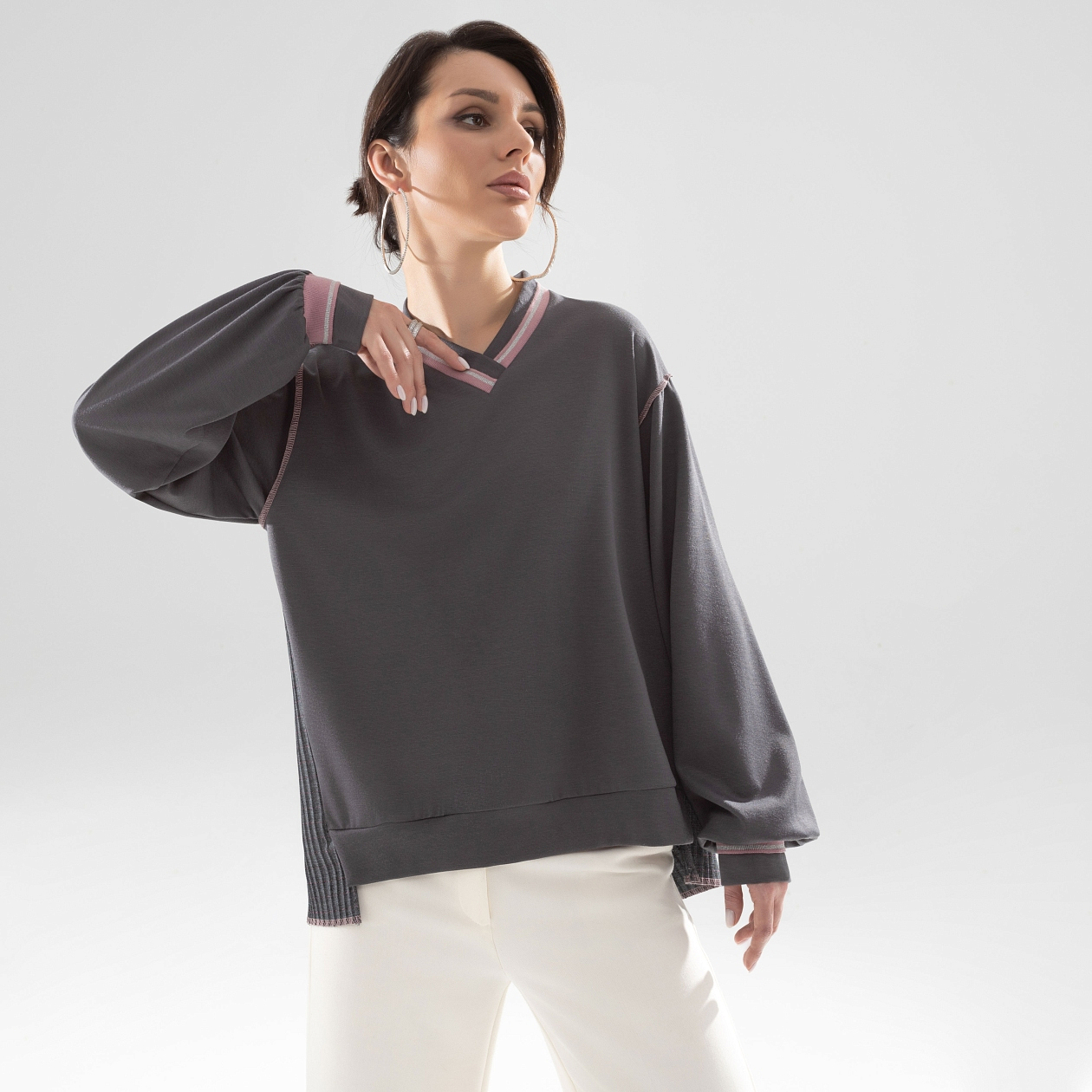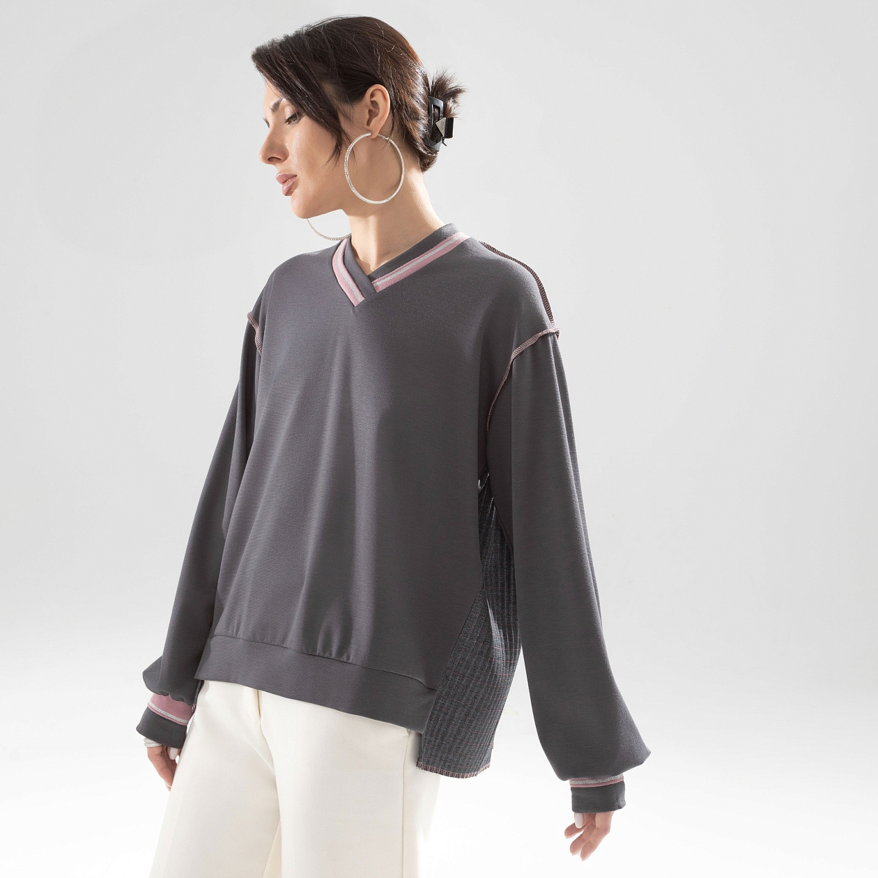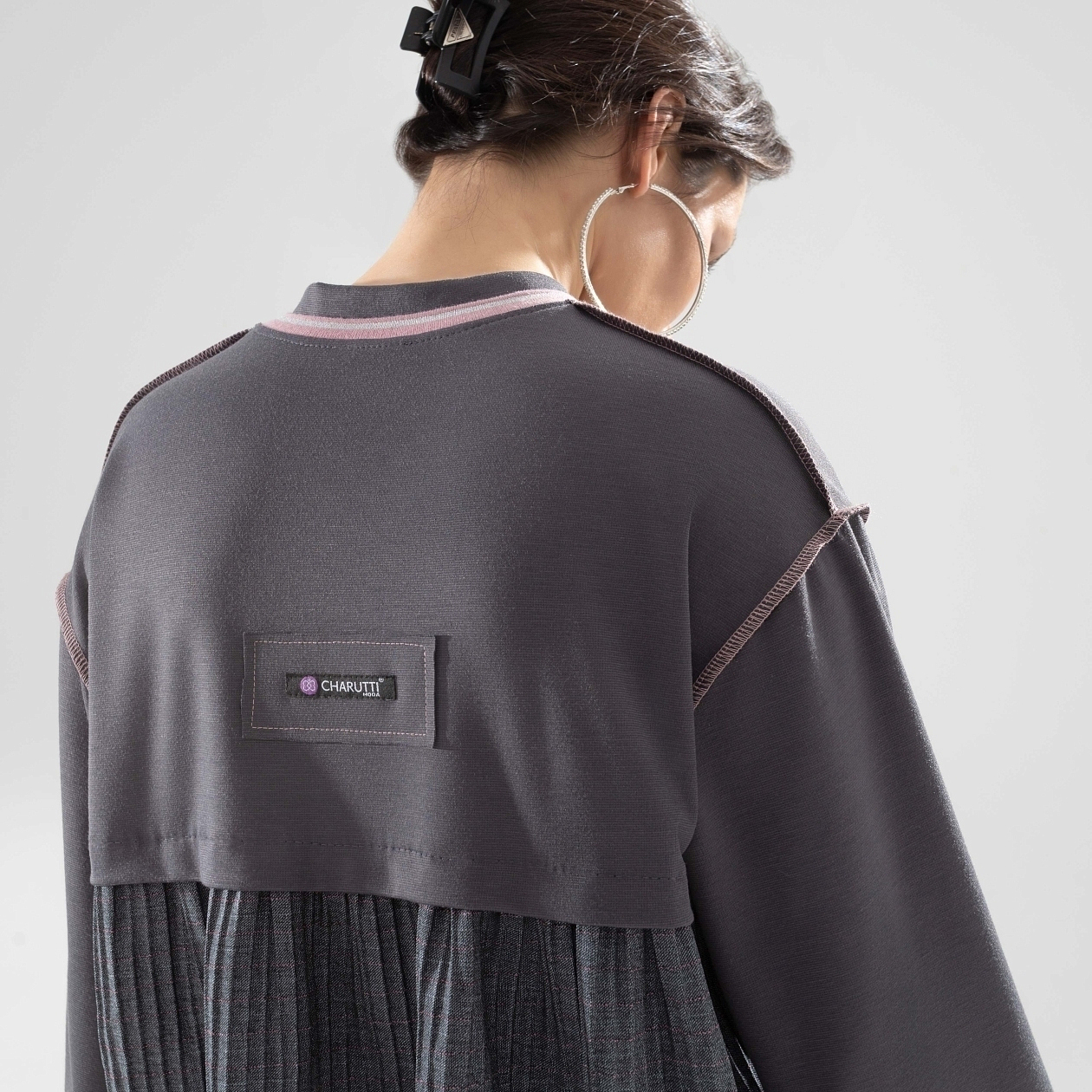 Быть, а не казаться в свитшоте CHARUTTI. Дизайнерский крой свитшота, помноженный на безупречный пошив и ткани из линейки премиальных материалов. Элегантный casual-образ для современной стильной женщины. Свитшот свободного кроя с акцентными швами наружу. Логотип бренда вшит на внешней стороне изделия на спинке. Комбинация нескольких видов материала. Линия плеча чуть спущена. Рукав удлинен.