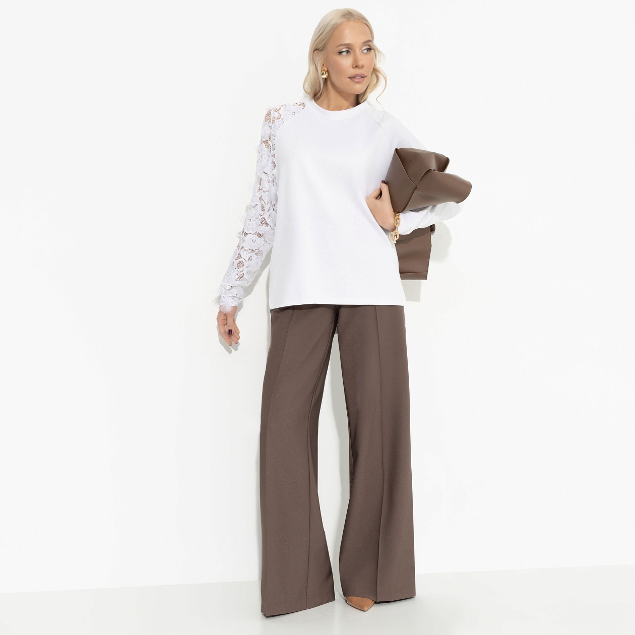 Совет от CHARUTTI – не ждать эфемерного подходящего момента, а покупать белый свитшот сейчас. В нем можно пойти на работу, на свидание и поехать в загородный отель. Будьте готовы в любой момент. Свитшот классического кроя. Кружево с объемным декором на одном рукаве. Свитшот хорошо смотрится в заправленном виде и навыпуск.