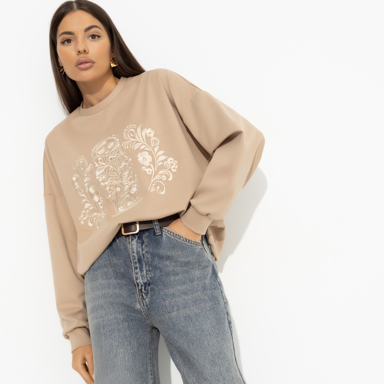 Теплое мягкое овсяное печенье, которое ты достаешь из духовки к приходу любимого с работы, может соревноваться в привлекательности только с тобой в свитшоте от CHARUTTI. Куда он подойдет в первую очередь? Уверены, к тебе! Свитшот свободного кроя на резинке. Линия плеча спущена. Принт вышит на передней части изделия.