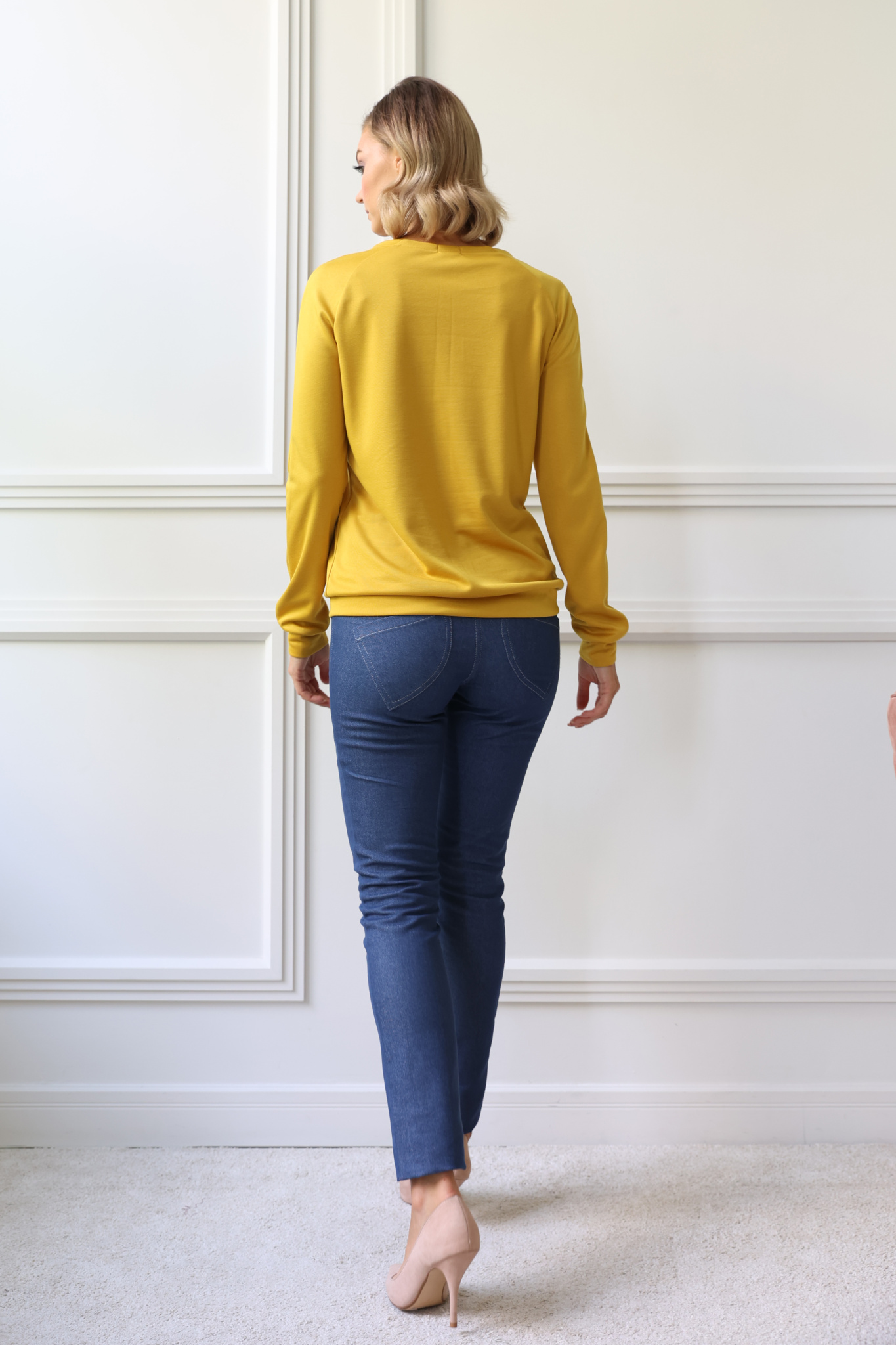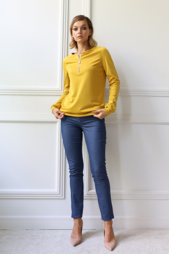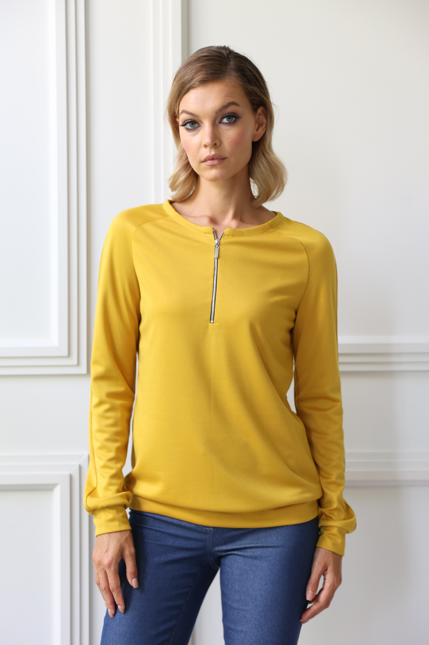 Свитшот с рукавами реглан и манжетами по низу, притачной пояс, круглая горловина и застежка на молнию по переду.