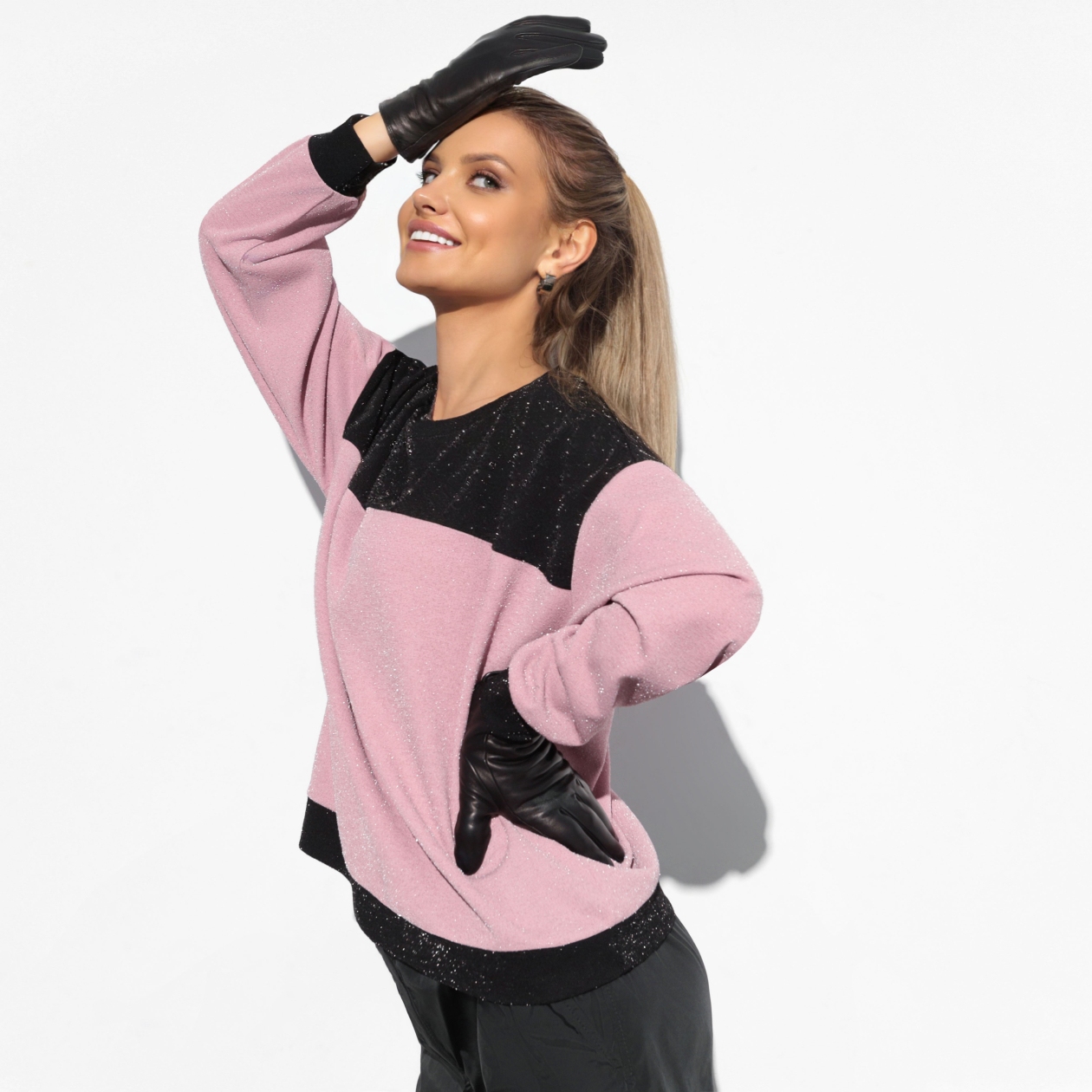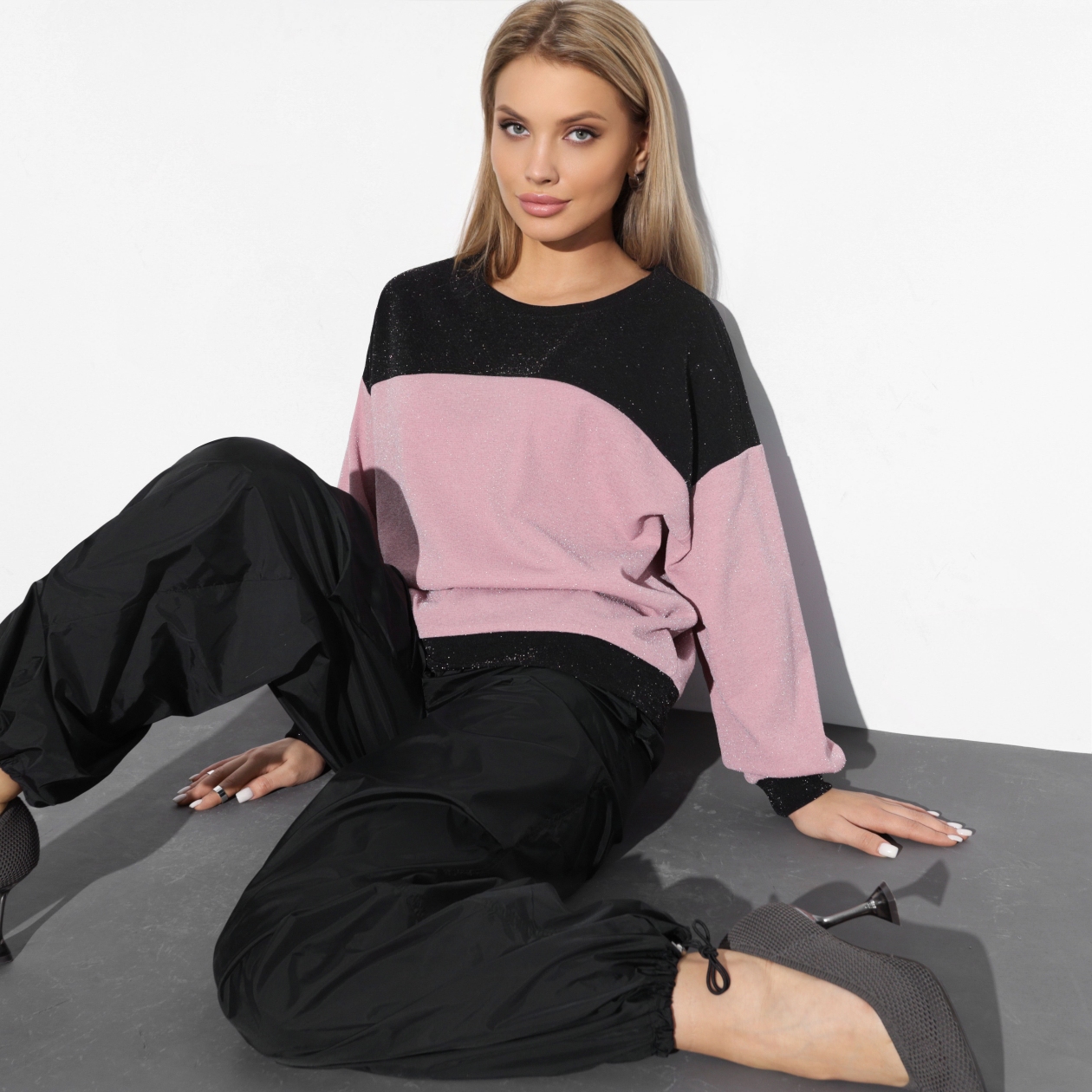 Baby pink + черный + блеск – драматичное сочетание, которое сделает тебя еще заметнее. Привлекай внимание, оставаясь в максимально комфортном и стильном образе.