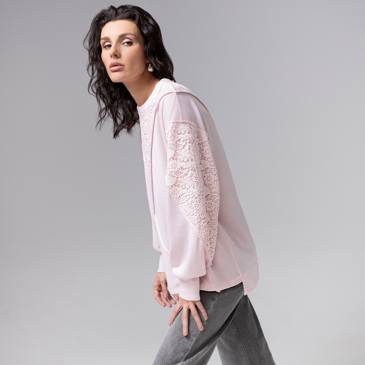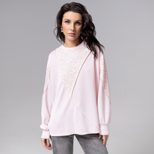 Свитшот ЧАРУТТИ из коллекции PREMIUM представляет собой гармоничный синтез повседневного комфорта и утонченной эстетики. Выполнен в нежно-розовой цветовой гамме, свободного кроя. Акцентные вставки из высокопрочного кружева и наружние швы добавляют образу деликатность и сложность текстуры. Безупречный крой изделия обеспечивает идеальную универсальную посадку, мягко драпируя силуэт.