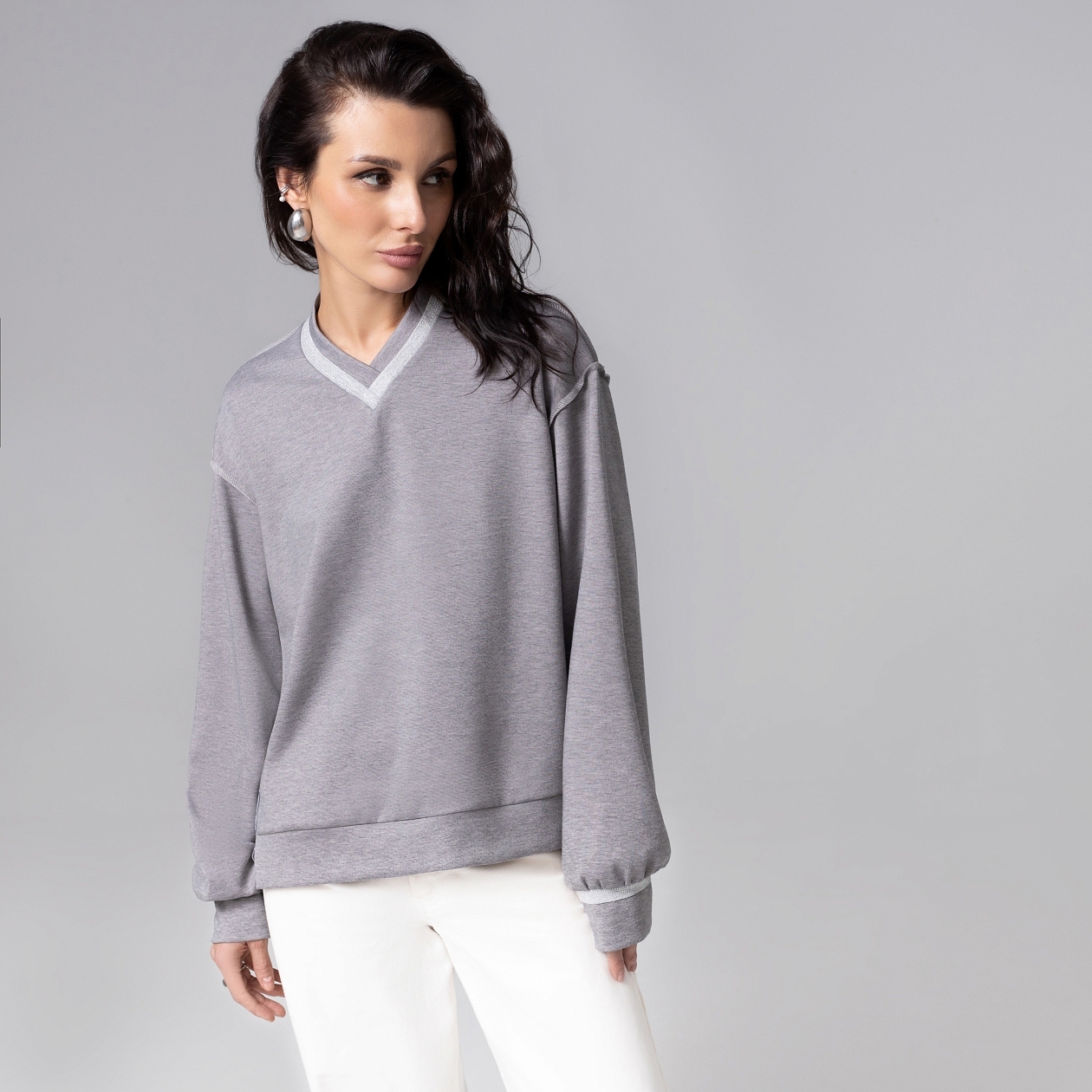 Минимум цвета, максимум характера. Серый свитшот со швами наружу доказывает: уверенность не нуждается в украшениях. Всё просто – «Успех в руках». Свитшот ЧАРУТТИ олицетворяет современную интерпретацию непринужденной элегантности. Его стильный крой, сочетающий объемность с четко выверенными пропорциями, обеспечивает идеальную посадку на любую фигуру. Акцентный крой спинки изделия из контрастной ткани-плиссе.
