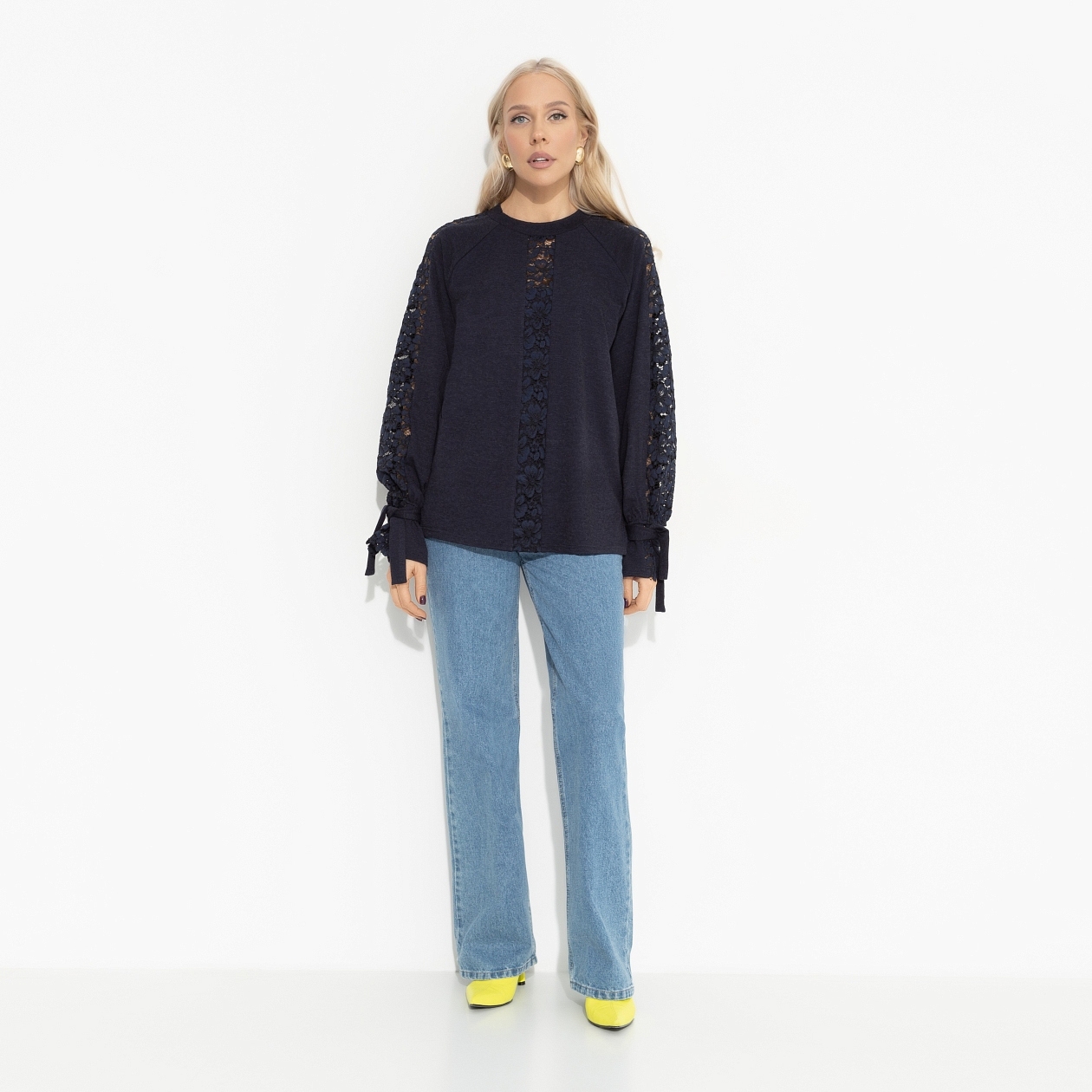 Глубокий синий – новый черный. Будьте в курсе последних трендов, не принося себя в жертву моде. Комфорт и идеальная посадка превыше всего. CHARUTTI знает, как сделать тренды носибельными. Свитшот свободного кроя. Оформлен кружевом в тон изделия. Круглый вырез горловины. Рукава оформлены завязками.