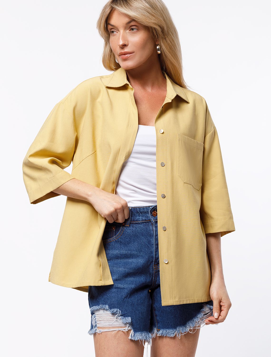 Блузка свободного кроя выполнена из плотного лиоцелла. Застежка на пуговицы из натурального перламутра. Добавление синтетических волокон в составе изделия предотвращает сминаемость. Подходит для любой фигуры. Для создания расслабленного образа, сочетайте в костюме с брюками D24.214, D24.218, шортами D28.054 и юбкой D26.181