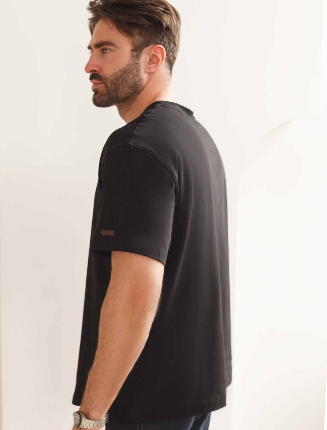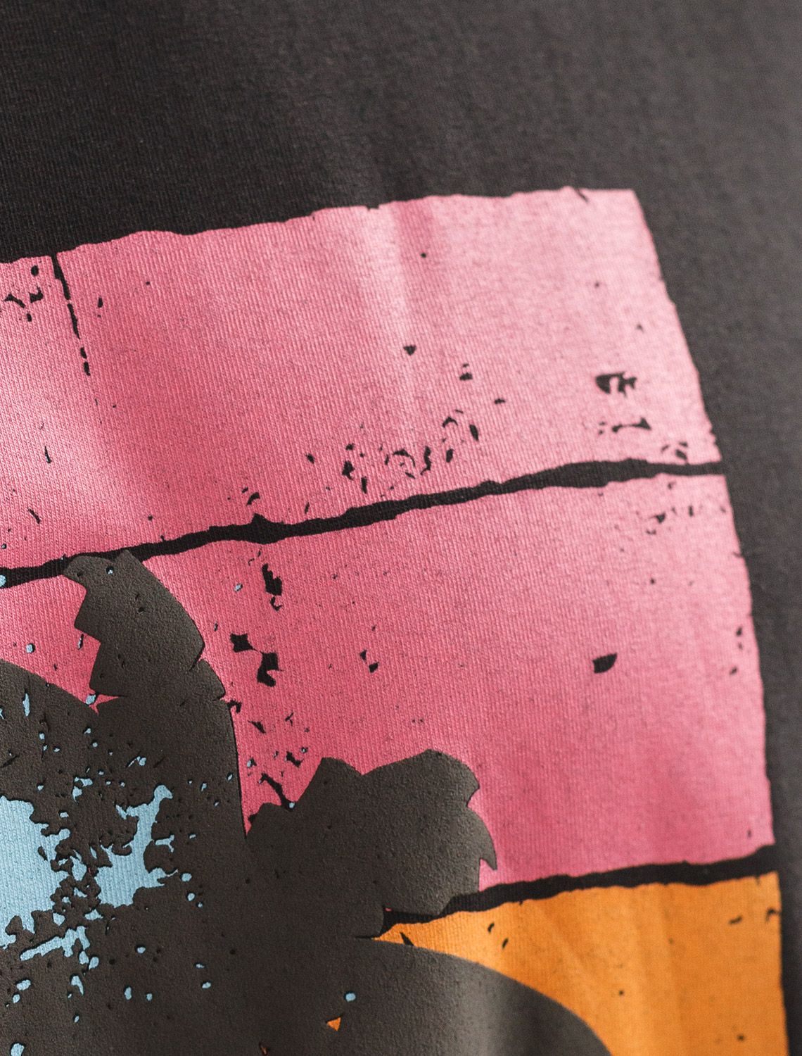 Перевод принта: Sunset - закат. Футболка свободного кроя выполнена из премиального хлопка. Авторский принт нанесен красками с устойчивым покрытием. Благодаря эластану, носить изделие очень комфортно, и оно сохранит свой безупречный вид в течение долгого времени. На рукаве нашивка из эко-кожи с логотипом бренда.