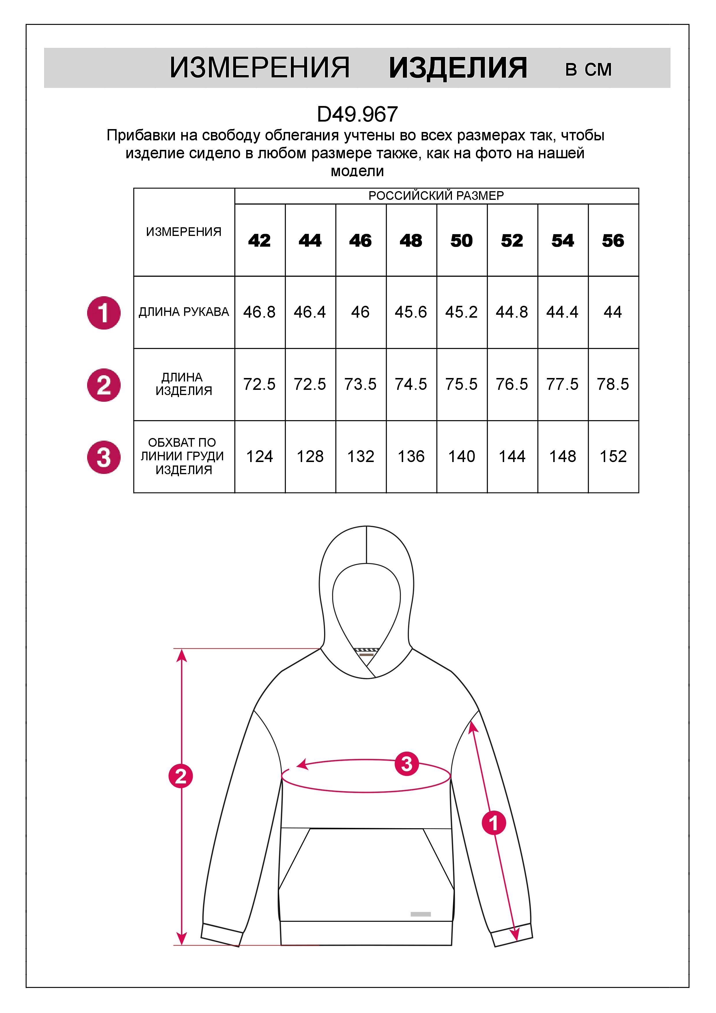 Свободное худи выполнено из футера-трехнитки с начесом. Модель over-size с классическим карманом-кенгуру, украшена металлическим логотипом бренда. Наличие эластана в составе изделия способствует меньшей сминаемости и формоустойчивости. Сочетайте в костюме с брюками D44.124 и D44.129
