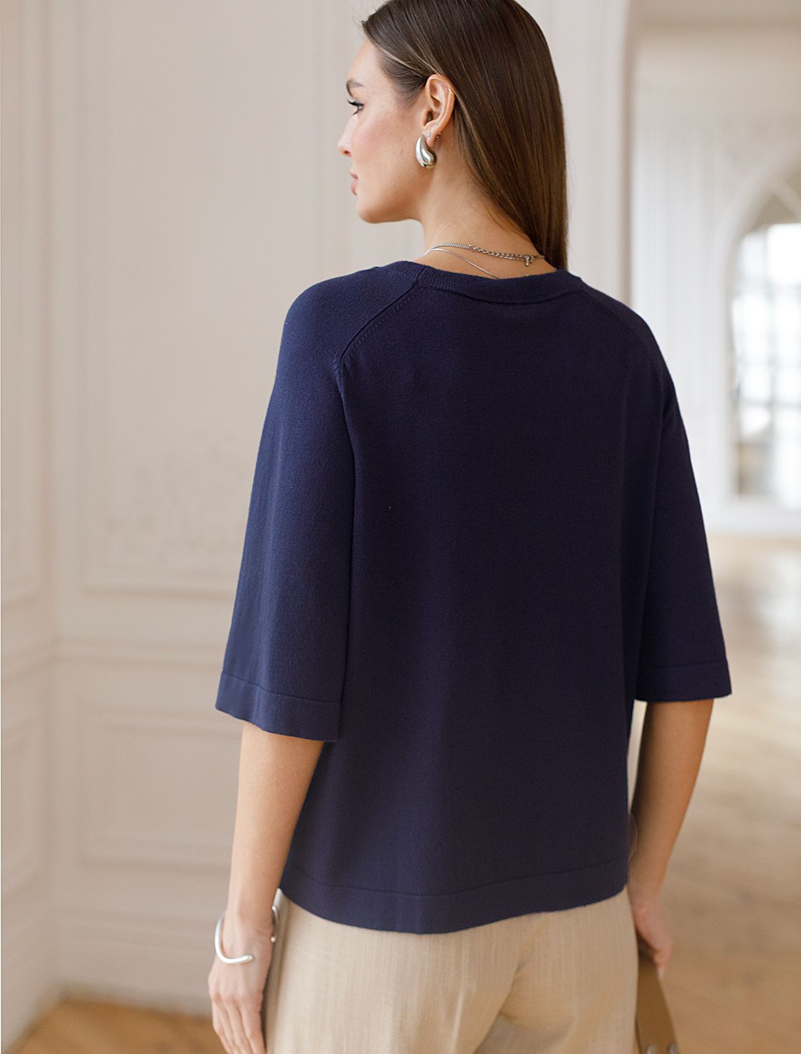 Легкий свободный джемпер темно-синего цвета с круглым вырезом идеально подходит на весну и лето. Тонкая вязка из вискозы дарит приятный комфорт и ощущение свежести в теплую погоду. Универсальная длина позволяет сочетать джемпер с разными элементами гардероба. Джемпер отлично смотрится на больших размерах благодаря продуманному крою и свободному фасону. Широкие рукава создают воздушность и делают силуэт особенно женственным. Этот джемпер с рукавом 3/4 станет незаменимой частью гардероба в сезоны, когда хочется легкости и элегантности одновременно. Лаконичный дизайн обеспечивает простоту комбинирования с другими вещами и будет универсальной базой для создания разнообразных комплектов — от офисного до непринужденного городского стиля.