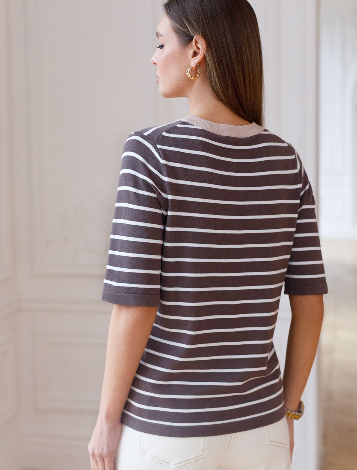 Свободный джемпер кофейного цвета в контрасную полоску из вискозы – выбор для тех, кто ценит стильный и современный образ. Благодаря средней длине и свободному крою джемпер гармонично смотрится на разных типах фигуры, а так же подходит на большие размеры, подчеркивая достоинства фигуры и скрывает возможные недостатки. Мягкая вискоза обеспечивает приятные ощущения к телу и подходит для ежедневной носки. Круглый ворот аккуратно подчеркивает линию шеи и подходит для разных вариантов укладки волос. Мягкий люрекс на контрастной отделке придает легкое мерцание, делая джемпер подходящим не только для повседневных выходов, но и для особых случаев. Принт выполнен в виде полосок, что делает классический джемпер актуальным в любом сезоне и который легко сочетается с разными стилями одежды. Рукав средней длины обеспечивает удобство и практичность в носке, позволяя использовать джемпер в прохладную погоду или для создания многослойных образов. Этот джемпер станет отличным дополнением гардероба, подчеркивая стиль и создавая легкую атмосферу непринужденности..