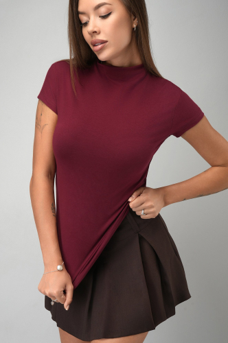 — однотонная темно-пурпурная футболка станет классным акцентом в повседневном образе.