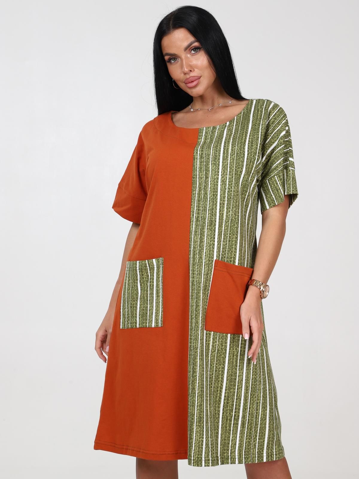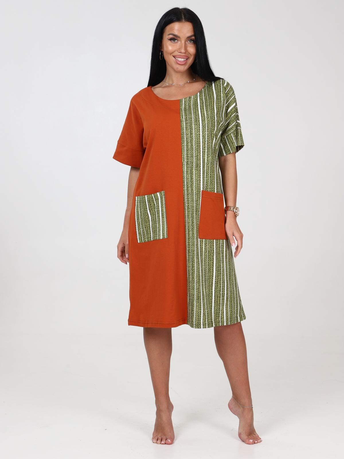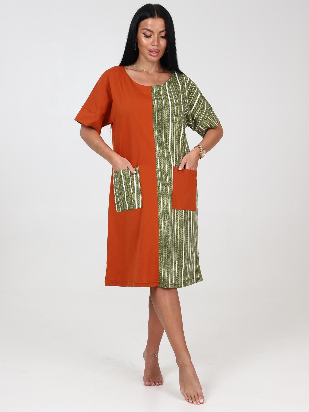 Туника выполнена из полотна "кулирка" двух контрастных расцветок. Модный в этом сезоне тренд, который можно назвать «цвет пополам», изделие визуально делится на половинки, выполненные, как правило, из одного материала, но в разных цветах. Туника свободного покроя со спущенным плечом, на каждой передней половине настрочной карман контрастного цвета.
