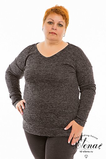 Джемпер выполнен из вязаного полотна с люрексом. Рукав длинный, со спущенной проймой. Вырез мягкий, V-образный. Спинка длиннее переда, по бокам небольшие разрезы. Внизу джемпер украшает вышивка в тон основному полотну.