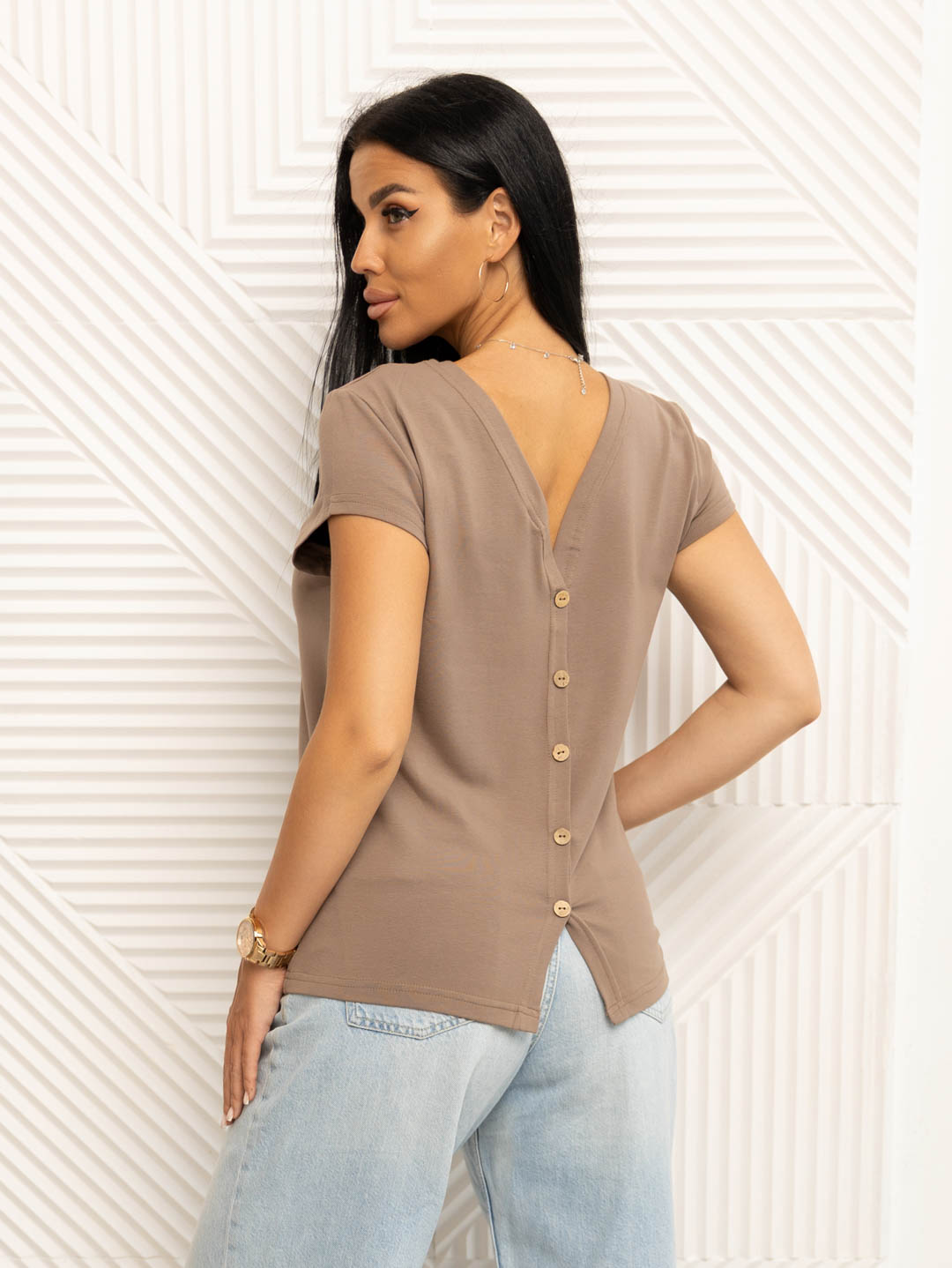 Футболка с оригинальным кроем, спинка выполнена на запах с фальшивой застежкой на пуговицы. Изделие представлено в нескольких базовых цветах.