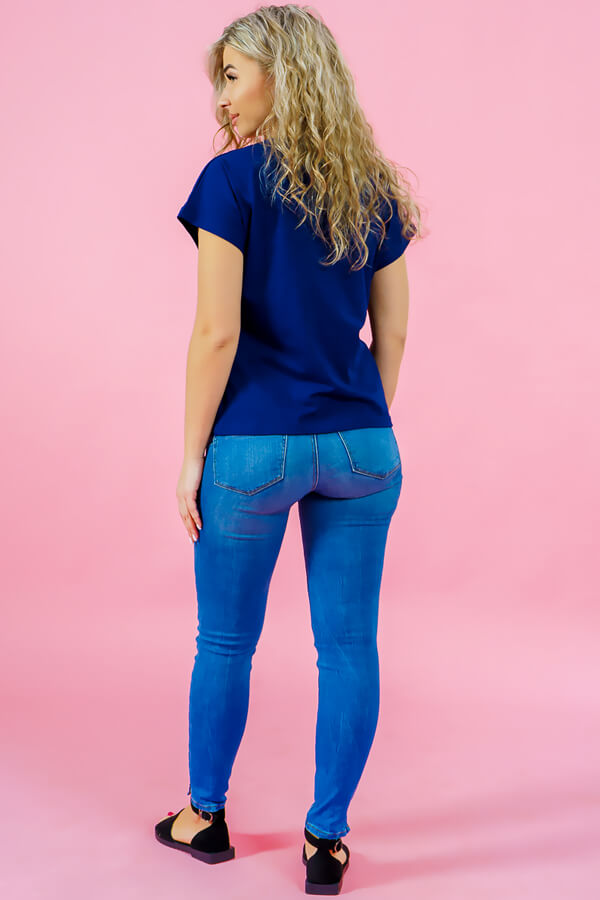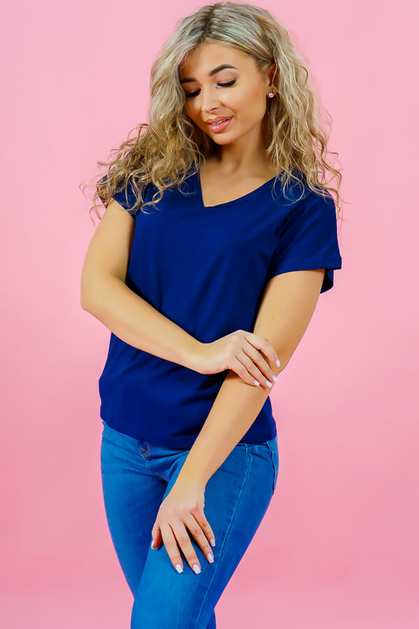 Футболка женская полуприлегающего силуэта, длиной чуть выше бедер с V-образной горловиной, цельнокраеным коротким рукавом. Это самый оптимальный и многофункциональный вариант. За счет свободного кроя не сковывает движений и прекрасно подходит для повседневного гардероба.