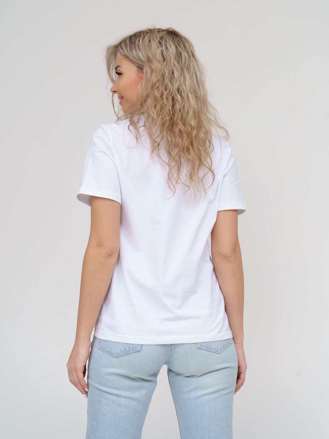 Футболка женская, прямого силуэта с принтом, О-образной горловиной. Рукав короткий, свободный. Футболка выполнена из трикоотажного полотна 100% хлопка.
