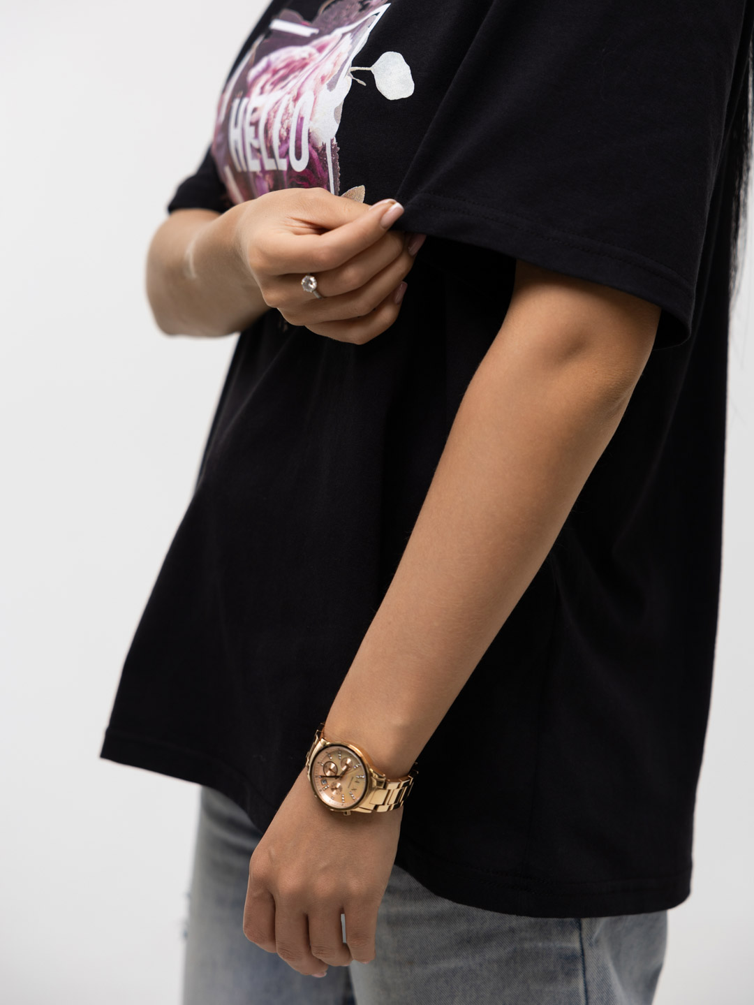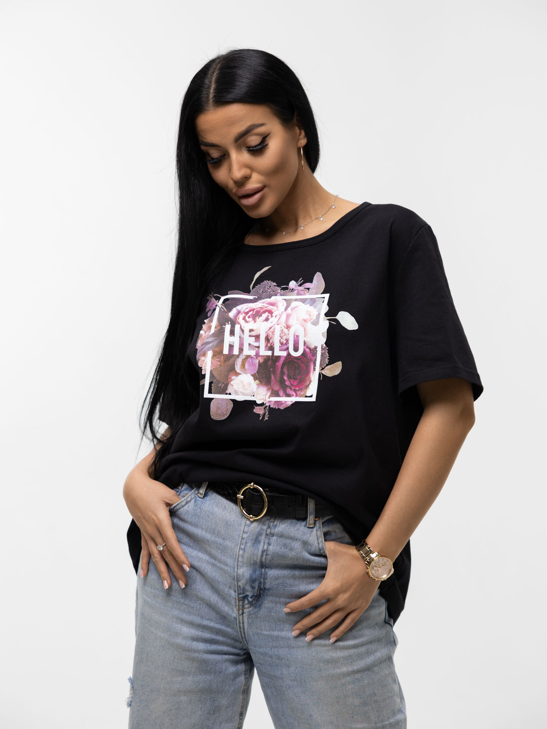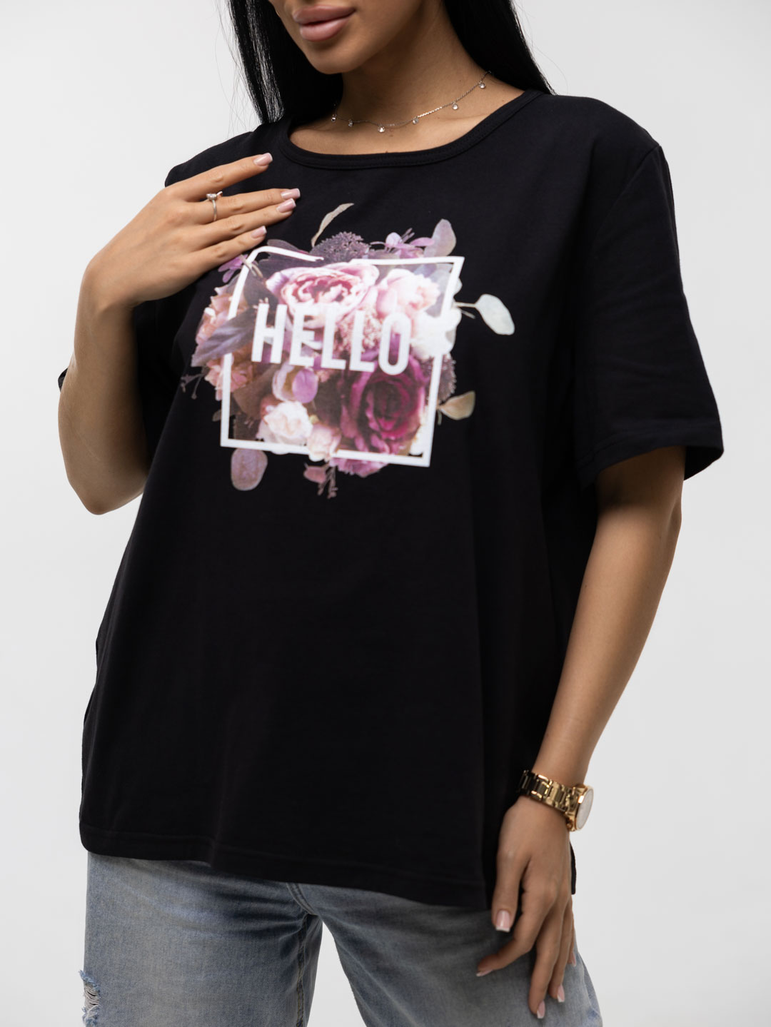 Футболка женская, прямого силуэта с принтом, О-образной горловиной. Рукав короткий, свободный. Футболка выполнена из трикотажного полотна 100% хлопка.