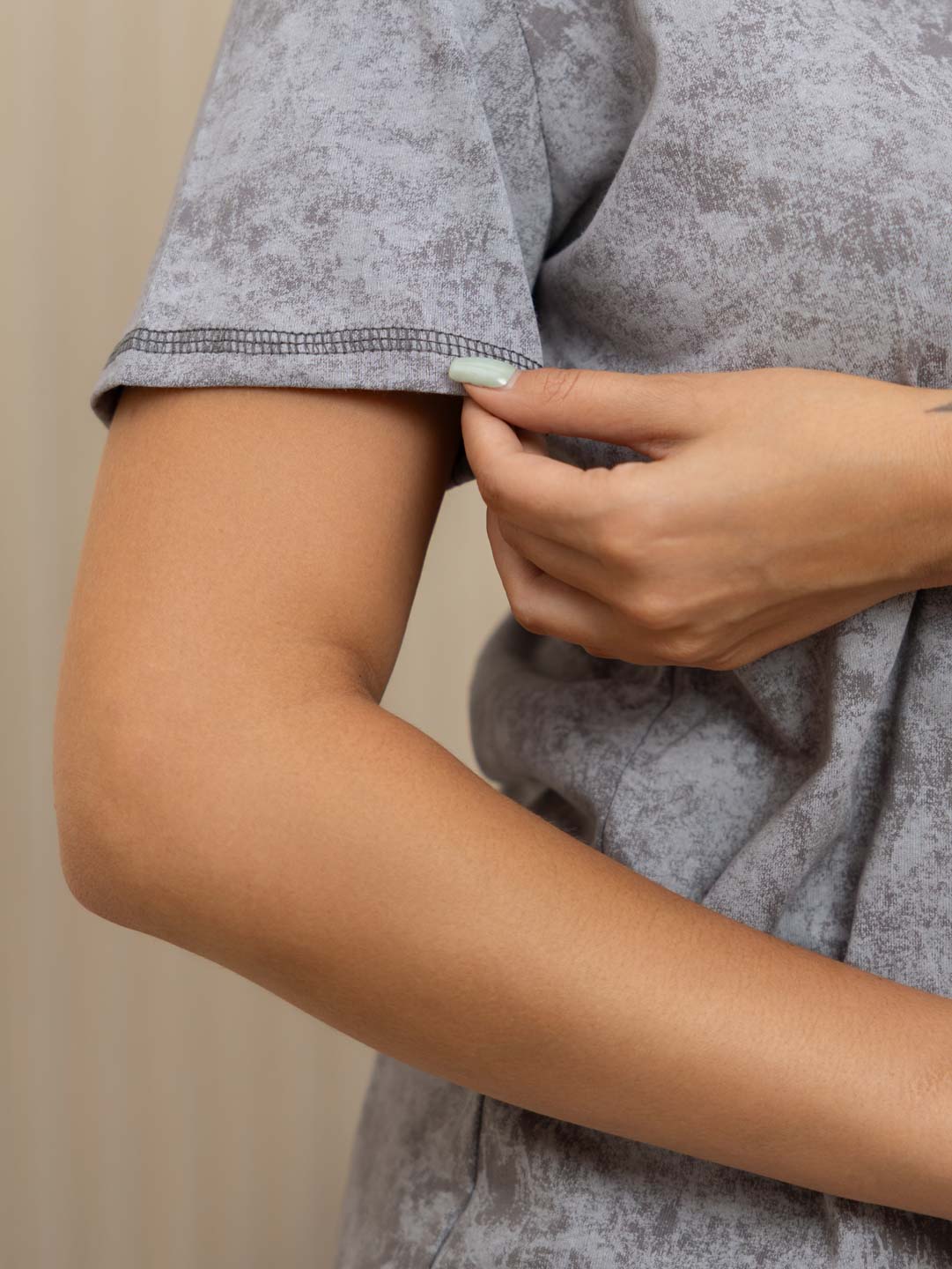 Футболка женская прямого кроя, с округлой горловиной и коротким спущенным рукавом. Материал футболки имеет яркий рисунок в стиле - варёнка.