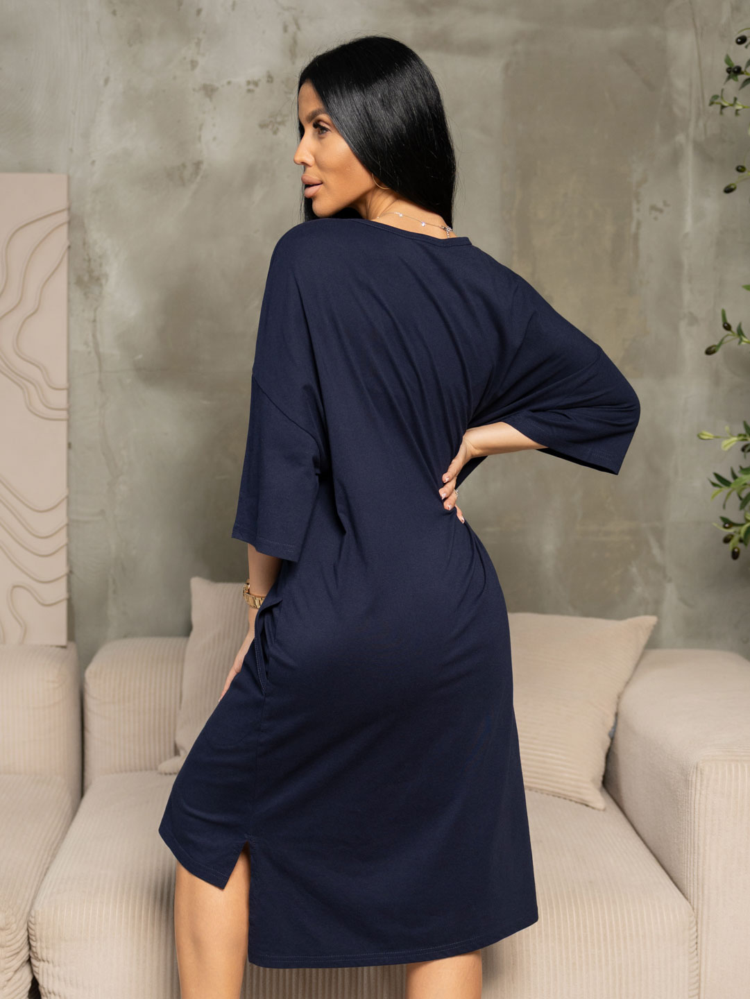 Туника женская трикотажная со спущенным коротким рукавом и округлым вырезом горловины. Уникальность данной модели заключается в расхождении длин передней и задней части изделия, что придает тунике современный дизайн и создает ощущение неповторимого чувства стиля у ее владельца. Боковой шов имеет удобные карманы и вырез в нижней части платья. На полочке печатный рисунок.