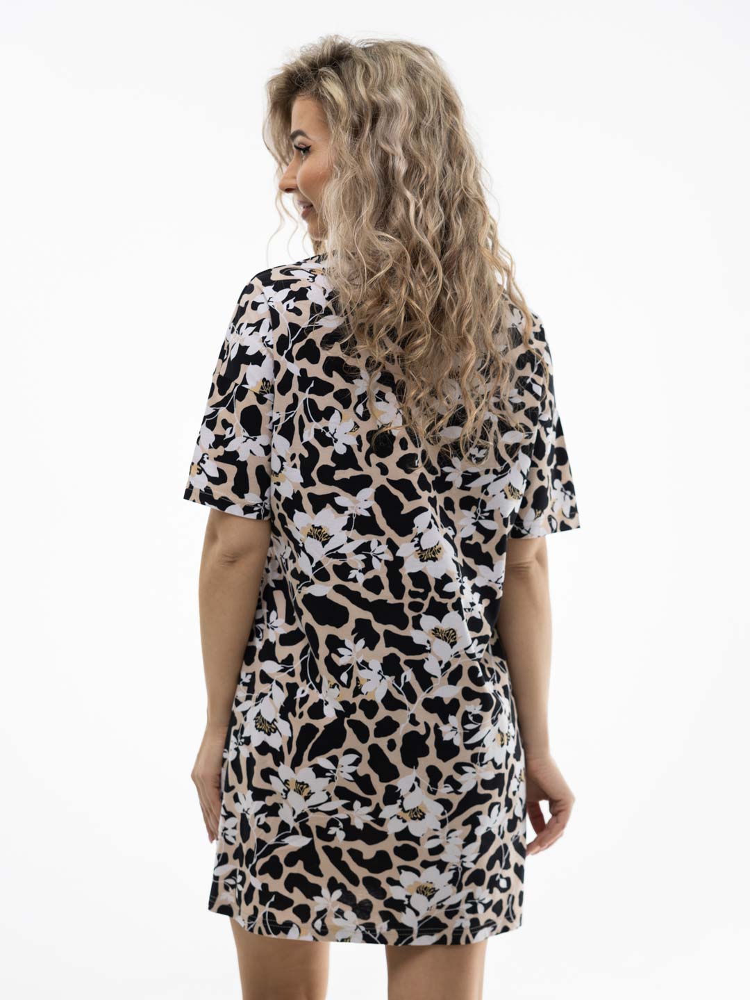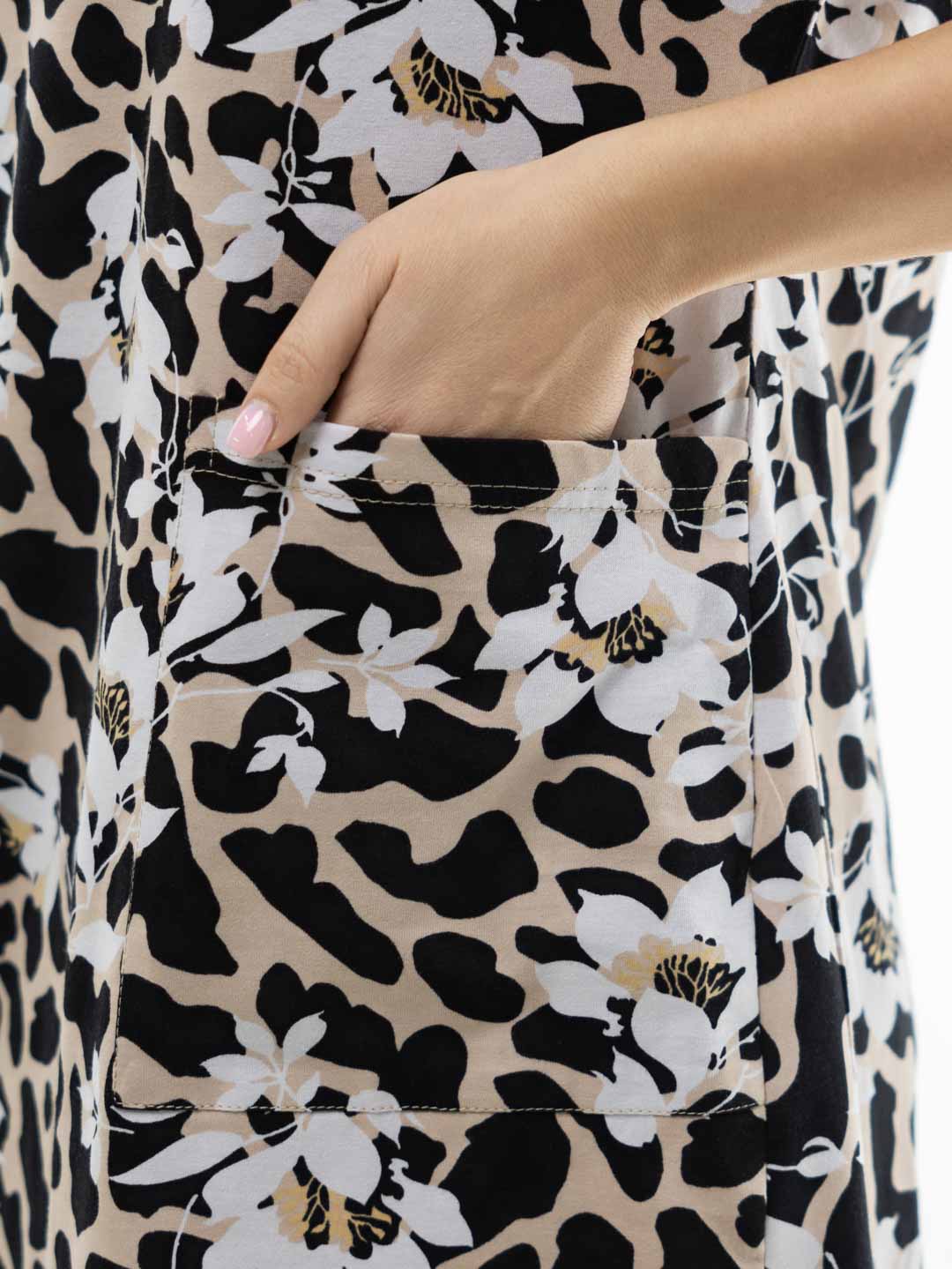 Туника женская прямого силуэта из хлопкового трикотажного полотна, длиной выше уровня колена. Платье имеет округлый вырез горловины. Спущенный короткий рукав и боковой вырез в нижней части придают данной модели особенный шарм, а накладные карманы и трендовый рисунок добавляют стиля и неповторимости.