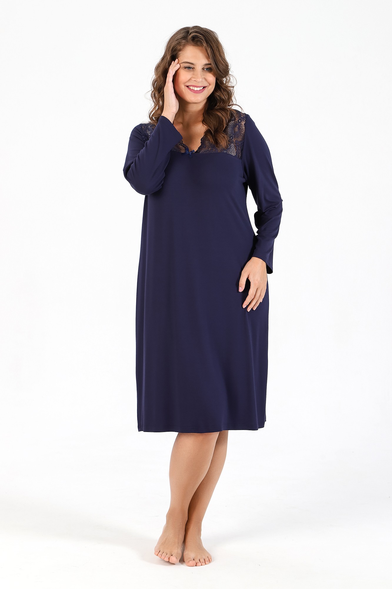 Сорочка женская из гладкокрашеного трикотажного вискозного полотна, прямого силуэта, с длинными втачными рукавами и горловиной V-образной формы. Перед с притачной кружевной кокеткой и декоративным бантиком из узкой атласной ленты в центре соединительного шва.