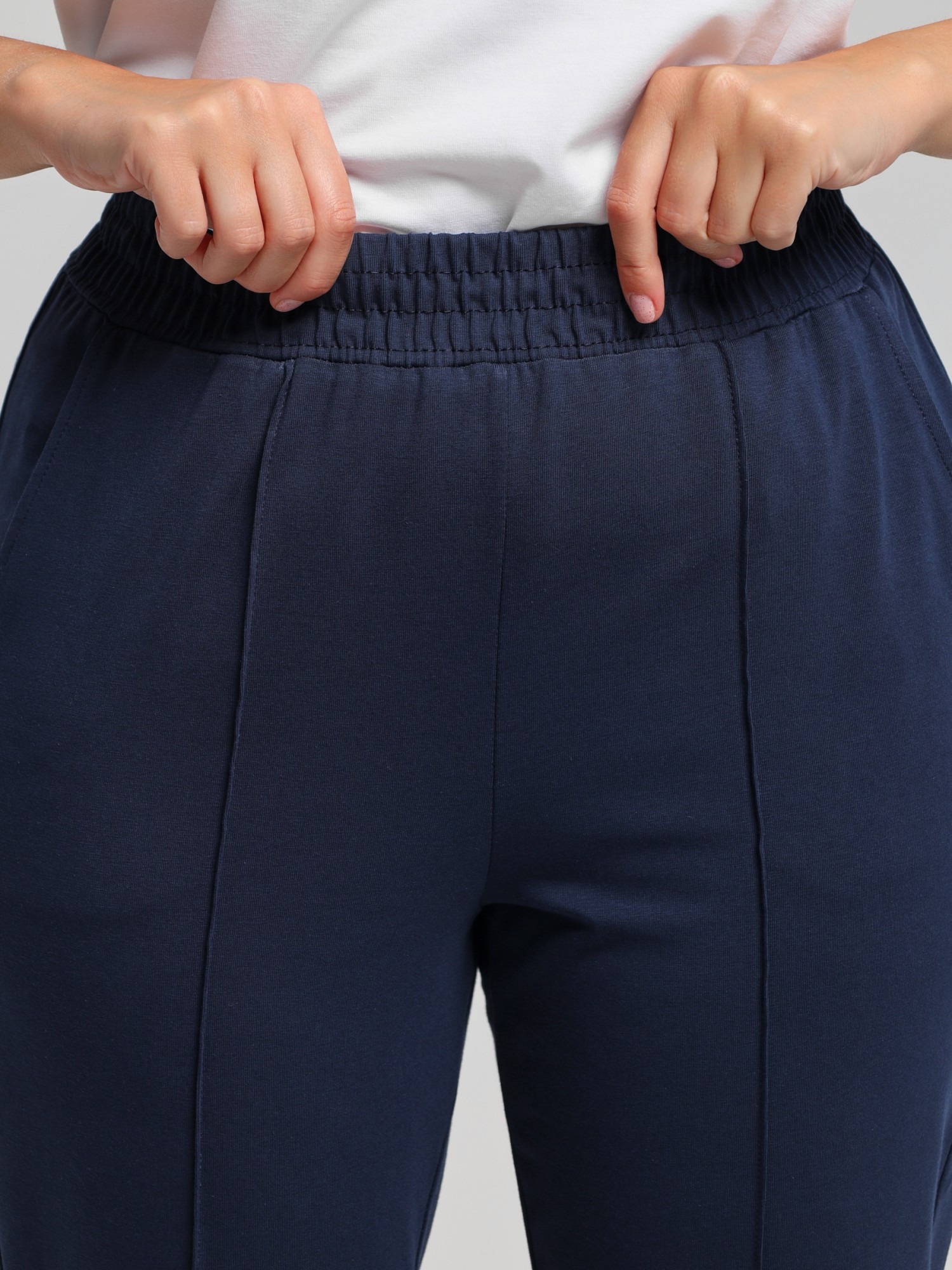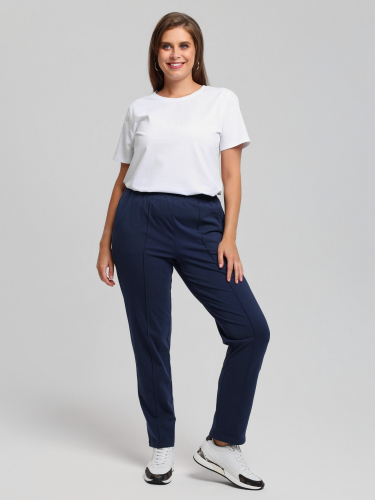 Брюки женские из гладкокрашенного трикотажного полотна «кулирка» с лайкрой, длинные, полуприлегающего силуэта, на притачном поясе с эластичной тесьмой внутри и карманами в боковых швах. Передние половины застрочены по центральным линиям, на задних половинах обработаны две вытачки в области талии.