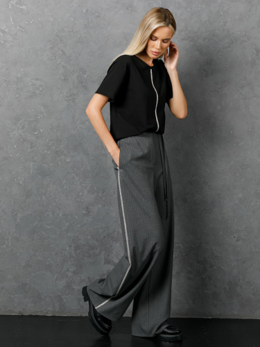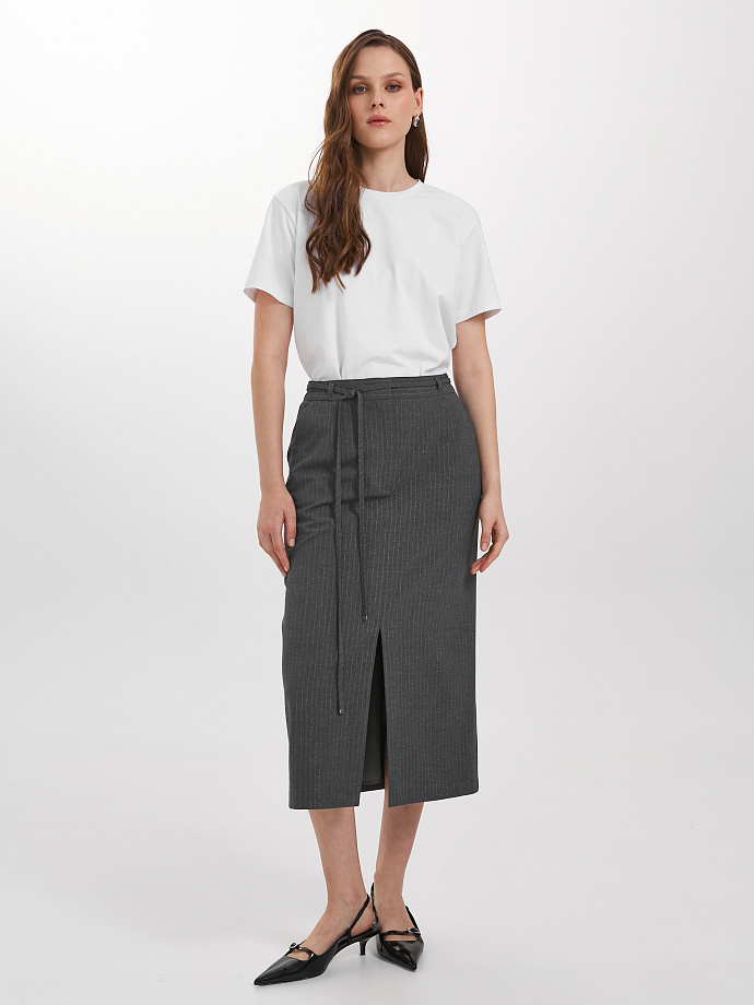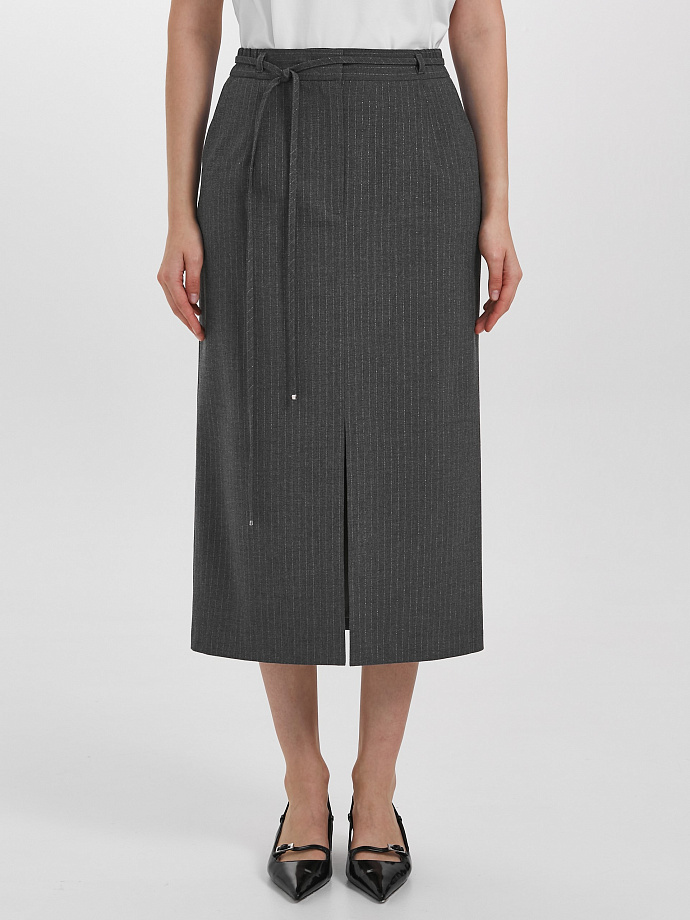 Модель прямого силуэта, на подкладе. Пояс притачной, с резиной и шлёвками. Спереди карманы в подрезных бочках и высокий разрез в среднем шве. Застёжка на молнию и крючки с пуговицей на поясе. Сзади прорезные карманы с листочкой. В шлёвки вставлен пояс-шнурок с наконечниками.