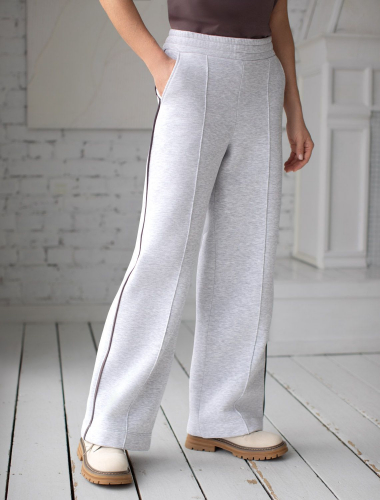 Теплые прямые брюки серого цвета с эффектом меланж из эластичного футера трехнитки с начесом созданы для максимального комфорта в холодную погоду. Мягкий материал приятный к телу, хорошо держит форму, не вытягивается и не теряет форму даже при активной носке. Благодаря дышащим свойствам премиального футера, брюки подходят на любую погоду, обеспечивая оптимальный микроклимат и уют. Свободный крой и эластичный широкий пояс делает посадку удобной для разных типов фигуры и размеров, включая большие и маленькие. Застроченные стрелки визуально вытягиват силуэт и подчеркивают эстетичнось повседневных брюк, а контрастные тонкие лампасы добавляют актуальности образу. Благодаря особенностям трехниточного плетения и внутреннему слою с начесом, эти брюки отлично сохраняют тепло в холодные осенние и зимние дни, при этом в них вы будете выглядеть модно и современно. Вы можете составить комплект с артикулами: D49.143 и D49.142