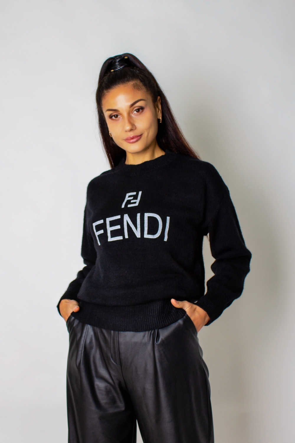 Рост модели на фото: 175 см, размер: 46-48. На ней представлен джемпер в едином размере 44-50