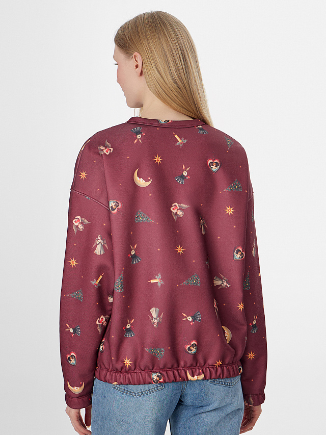 Бордовый свитшот с графичным узором игрушек на бордовом фоне станет ярким акцентом в вашем гардеробе. Его свободный силуэт со спущенным плечом и длинными рукавами дарит ощущение расслабленности и повседневного уюта, не ограничивая движений.