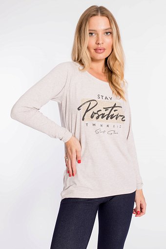 Толстовка выполнена из однотонной кулирки с лайкрой. Вырез горловины круглый, длинный рукав покроя реглан, спереди нанесён принт. Низ изделия разноуровневый, сзади длиннее, чем спереди. Горловина, рукава и низ отделаны эластичной тканью в цвет основного полотна.