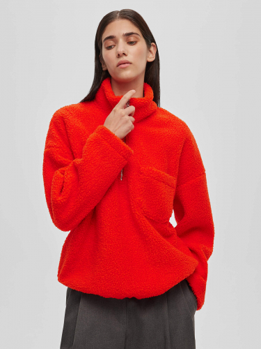 Базовая толстовка из двухслойного флиса с мягким велюровым основанием обеспечит вам максимальный комфорт и тепло. Свободный крой и спущенное плечо создают непринужденный силуэт, а воротник-стойка добавляет защиту от холода. Застёжка на молнии и два передних кармана на молнии делают её практичной для повседневного использования.