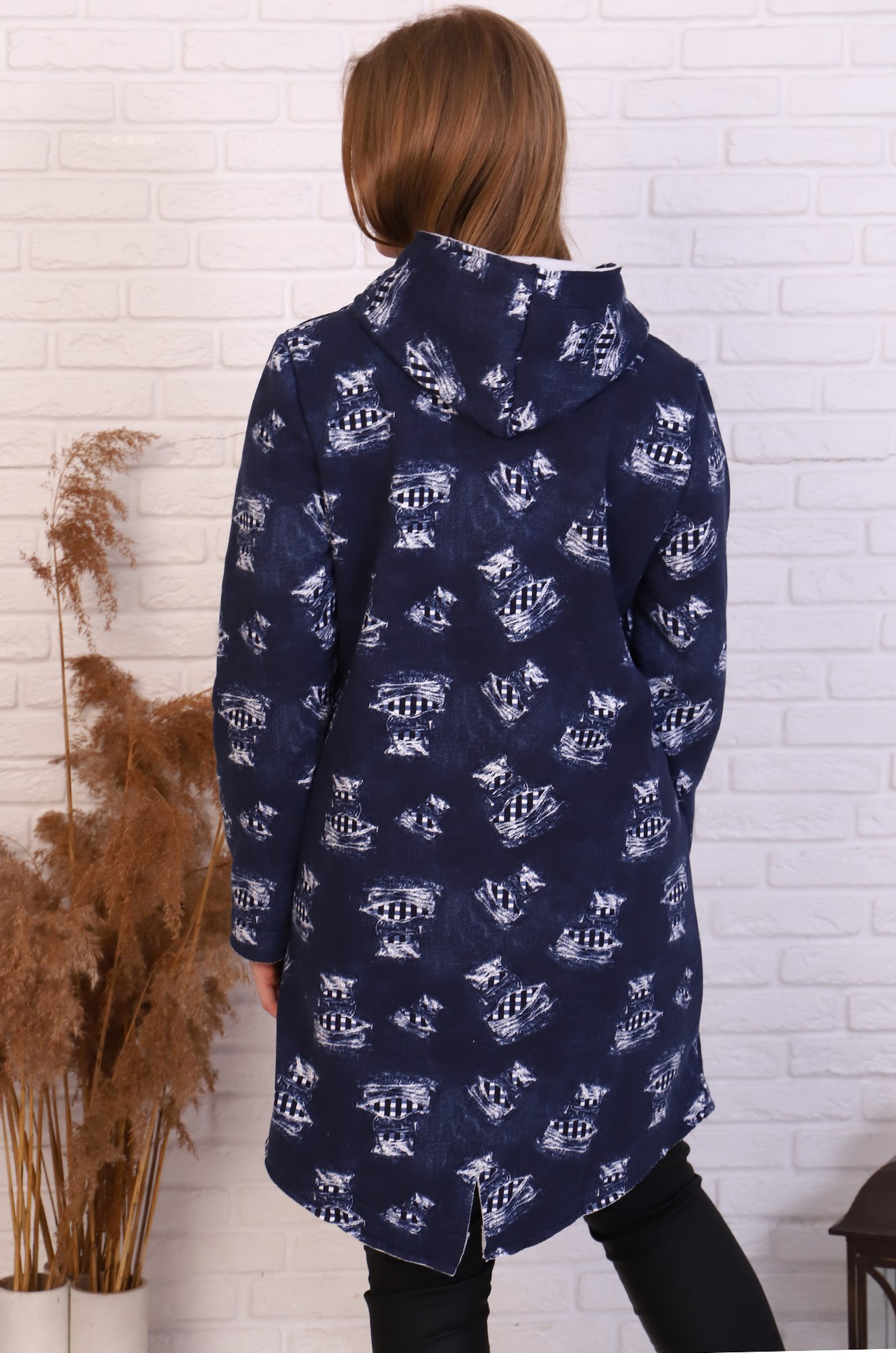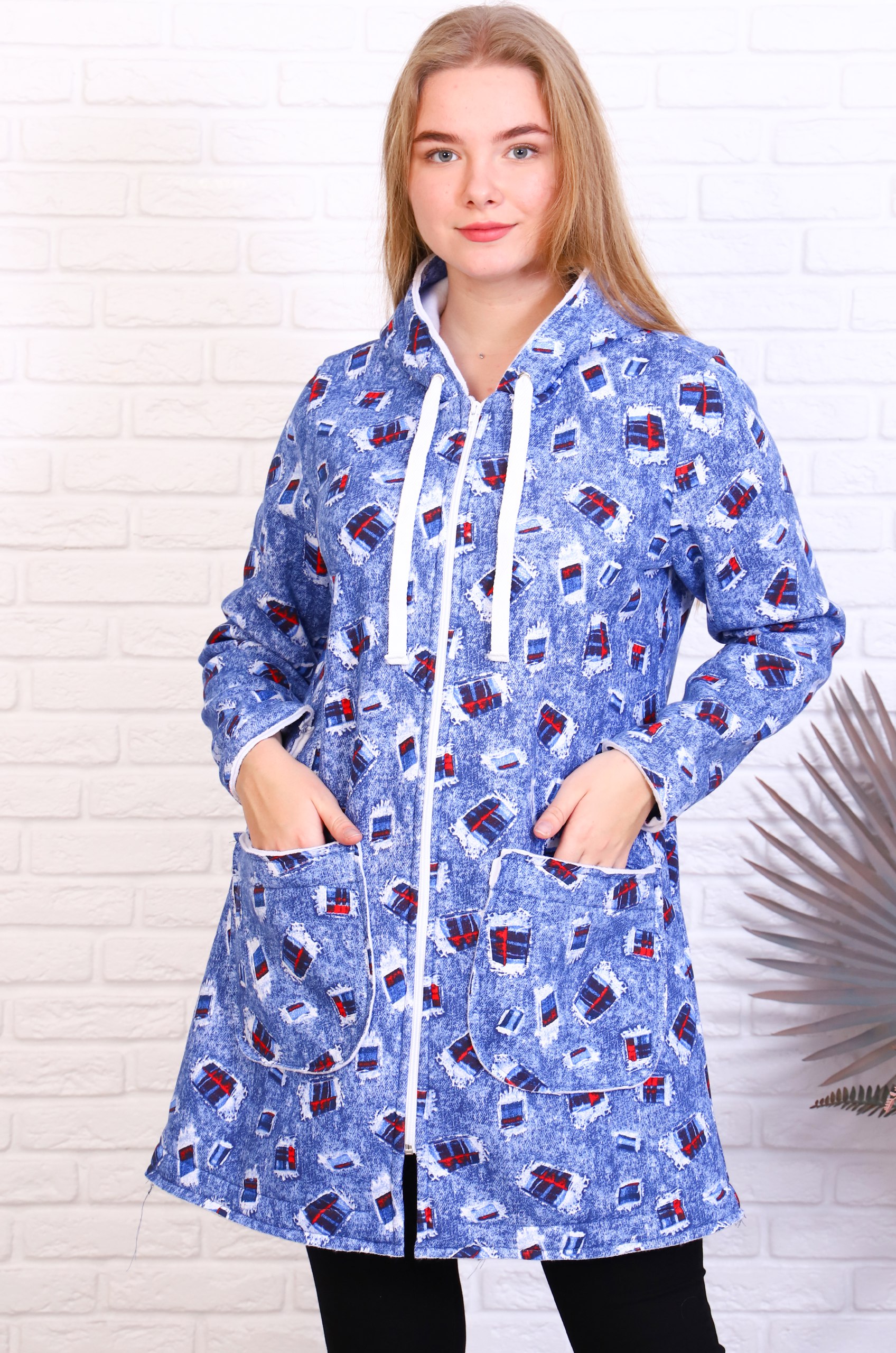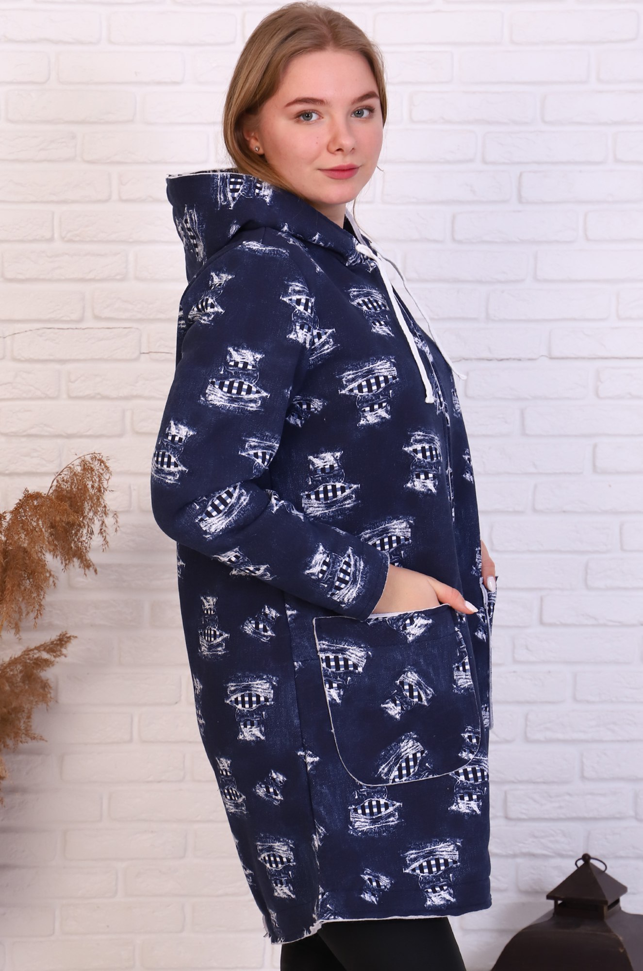 Удлиненная толстовка-парка на молнии с капюшоном. Края изделия не обработаны, капюшон со шнурком, два больших накладных кармана, сзади разрез.